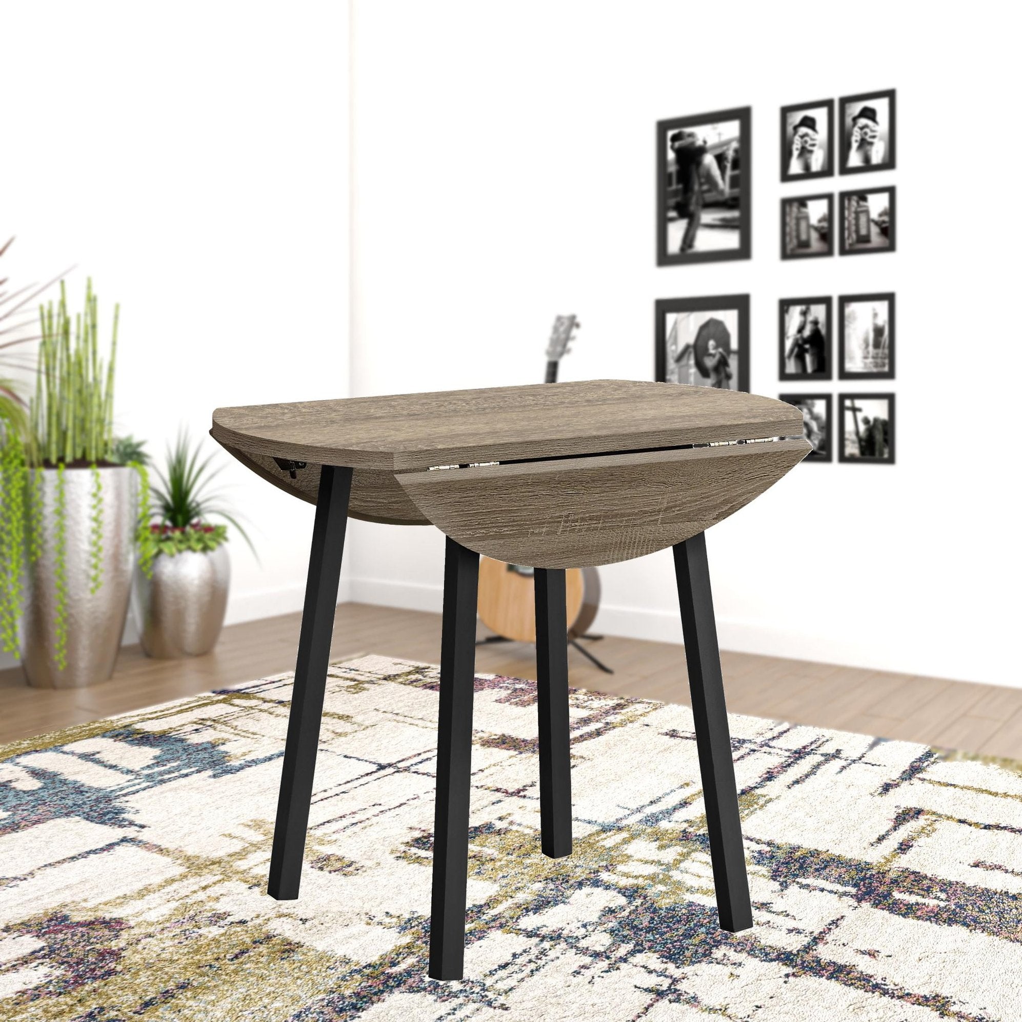 - Round dining set with drop leaf mechanism.