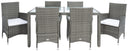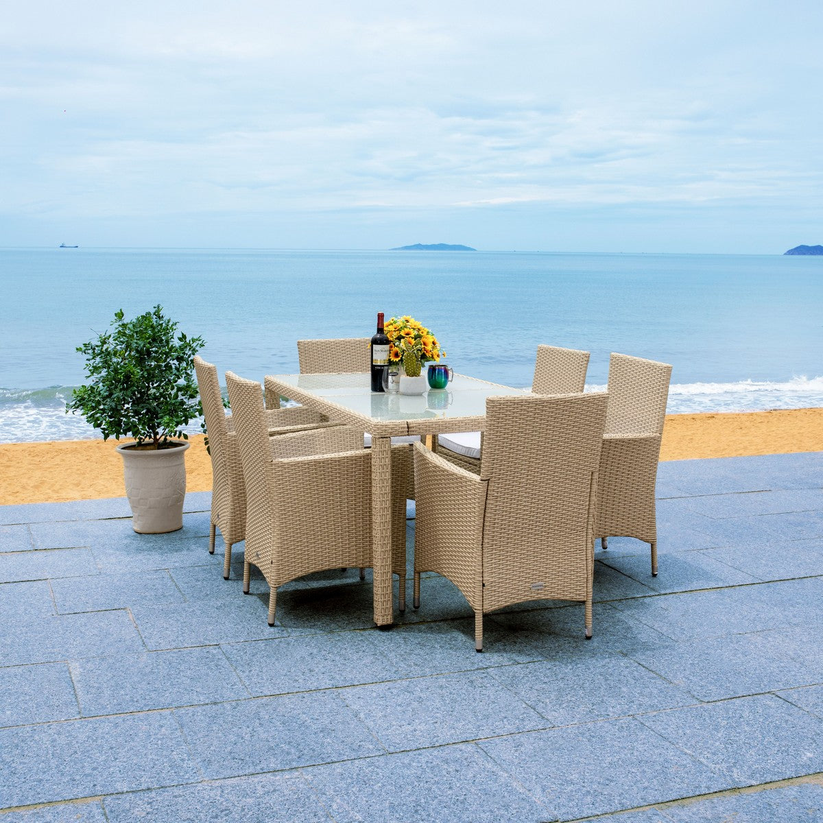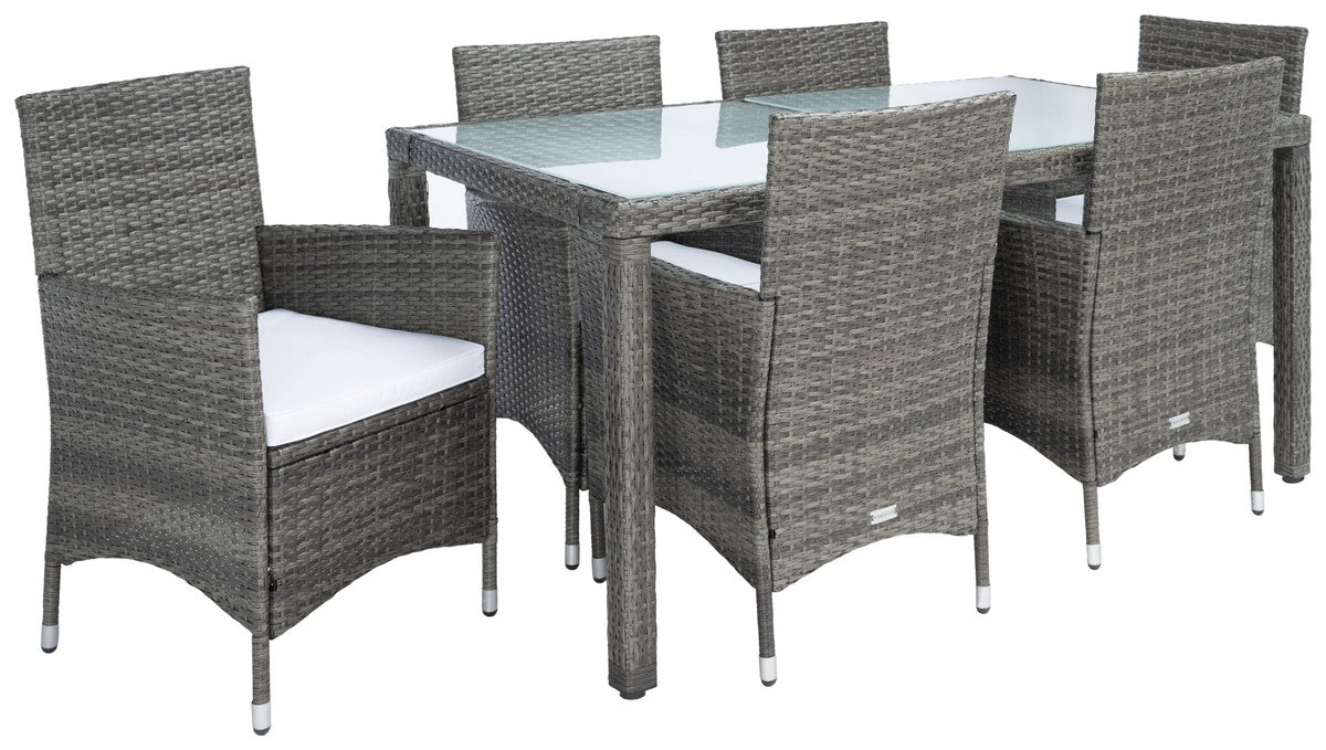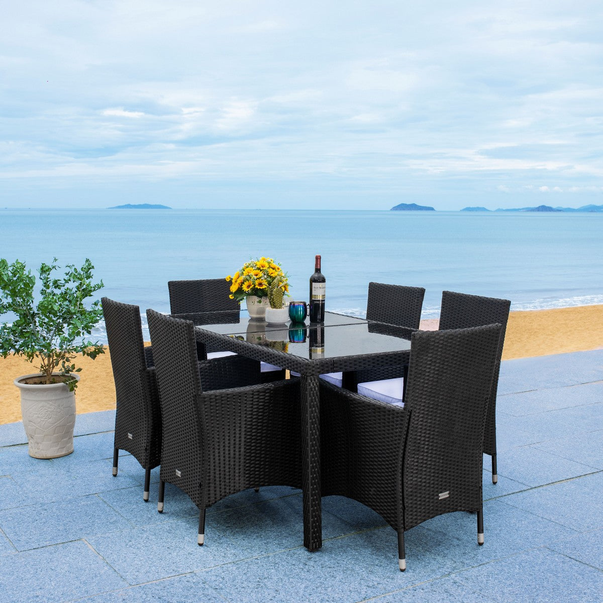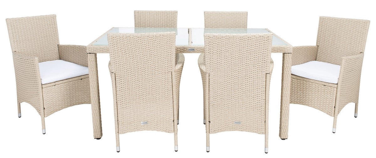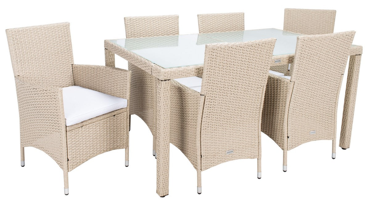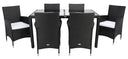 Outdoor entertaining gets a contemporary chic upgrade in this Jolin 7 Piece Dining Set. Black wicker details highlight the eye catching silhouettes of Jolin’s six dining chairs, and plush white cushions will keep you and your guests around the glass topped dining table for hours of delightful conversation.