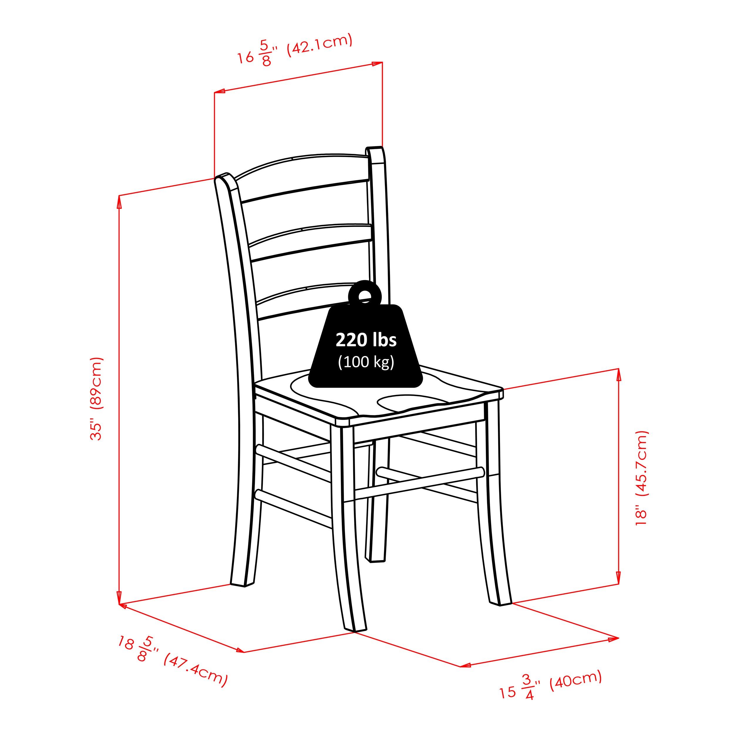 - this set comes with 2 ladder back chairs, each is 16.60"W x 20.50"D x 34.70"H. Seat height is 18".