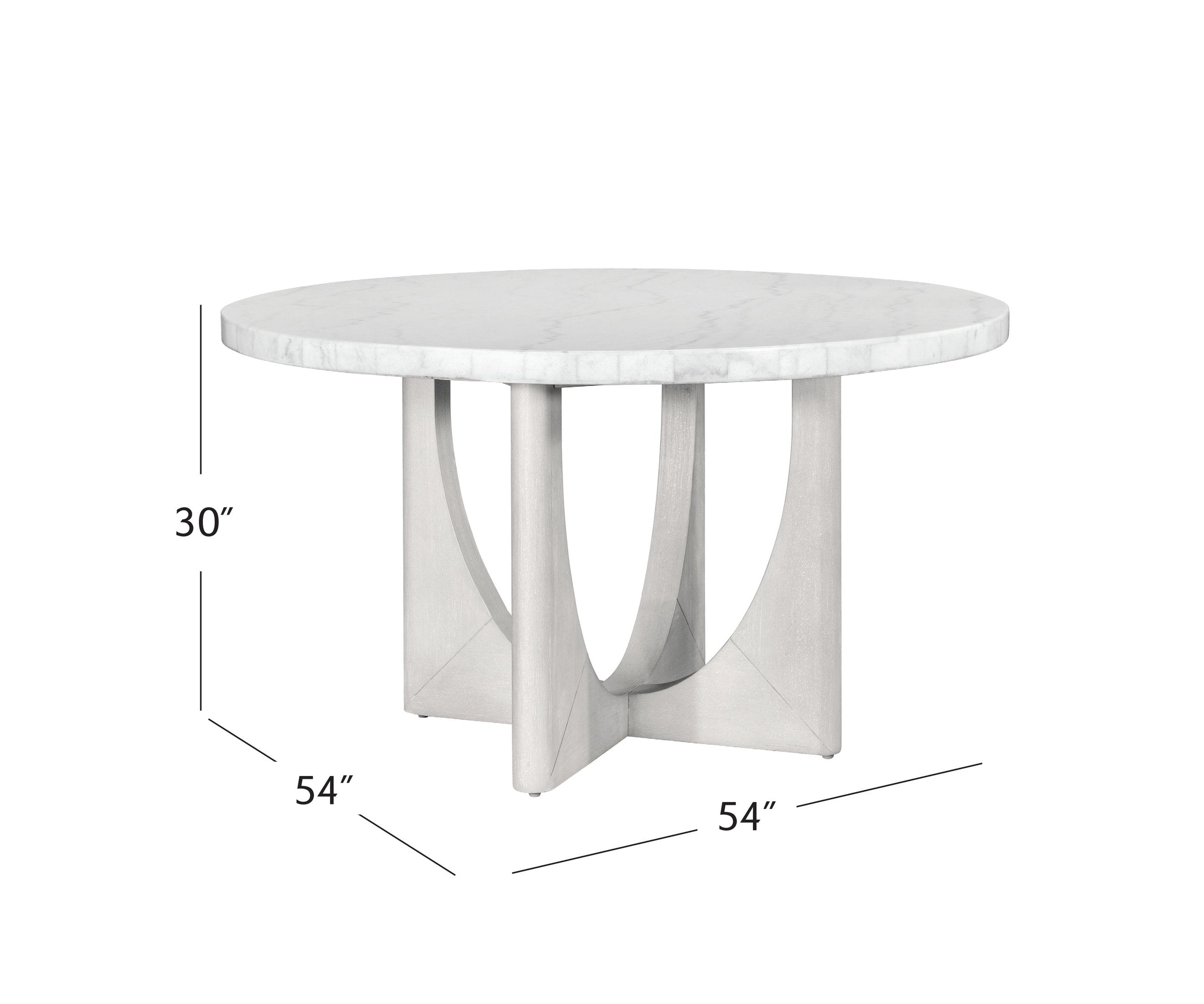 - 54" round white marble tabletop paired with a driftwood-finished solid wood base