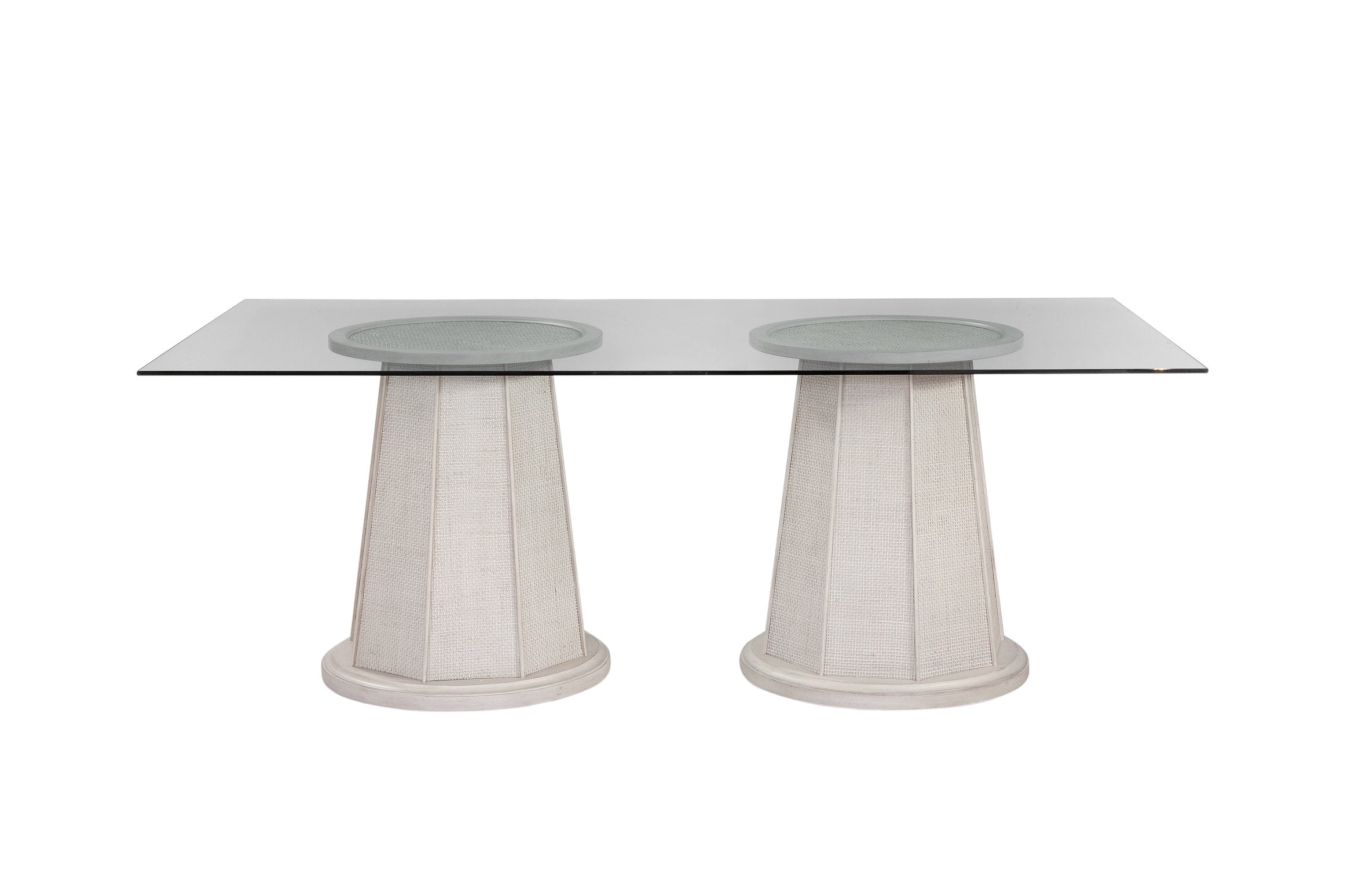- Modern Boho and Coastal design merge elegantly in the Korey Round Dining Table, with a tapered pedestal base and intricate box-weave cane detailing, all finished in a serene white-wash on mindi veneers