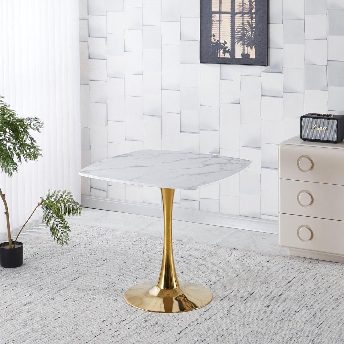Give your small dining area a sleek mid-century modern upgrade with this compact tulip-style dining table. Its clean white MDF top and golden pedestal base create an elegant focal point that works equally well in kitchens, apartments, bistros, or living-room seating nooks. Built for 2–4 people, the table balances style, stability, and easy upkeep for everyday meals or casual entertaining.