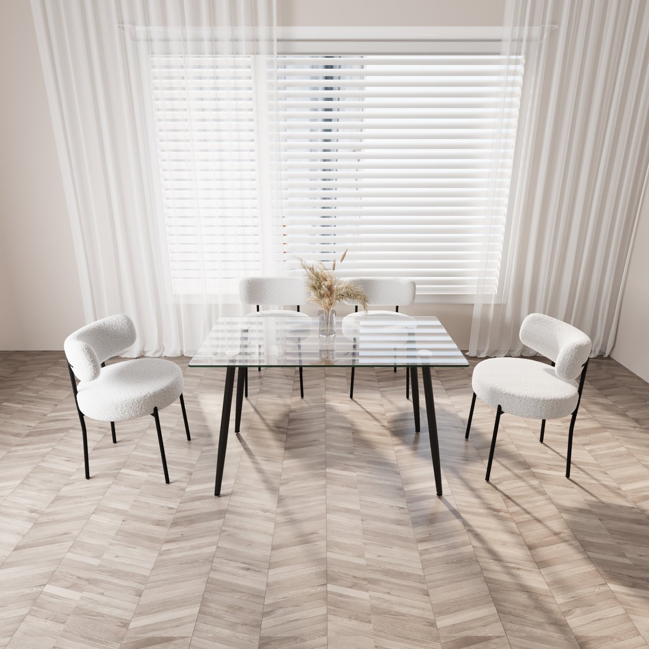 - 2.Glass Dining Table: Elevate your dining space with our glass dining table, boasting a sleek design with four Black metal legs that seamlessly combine style and stability.