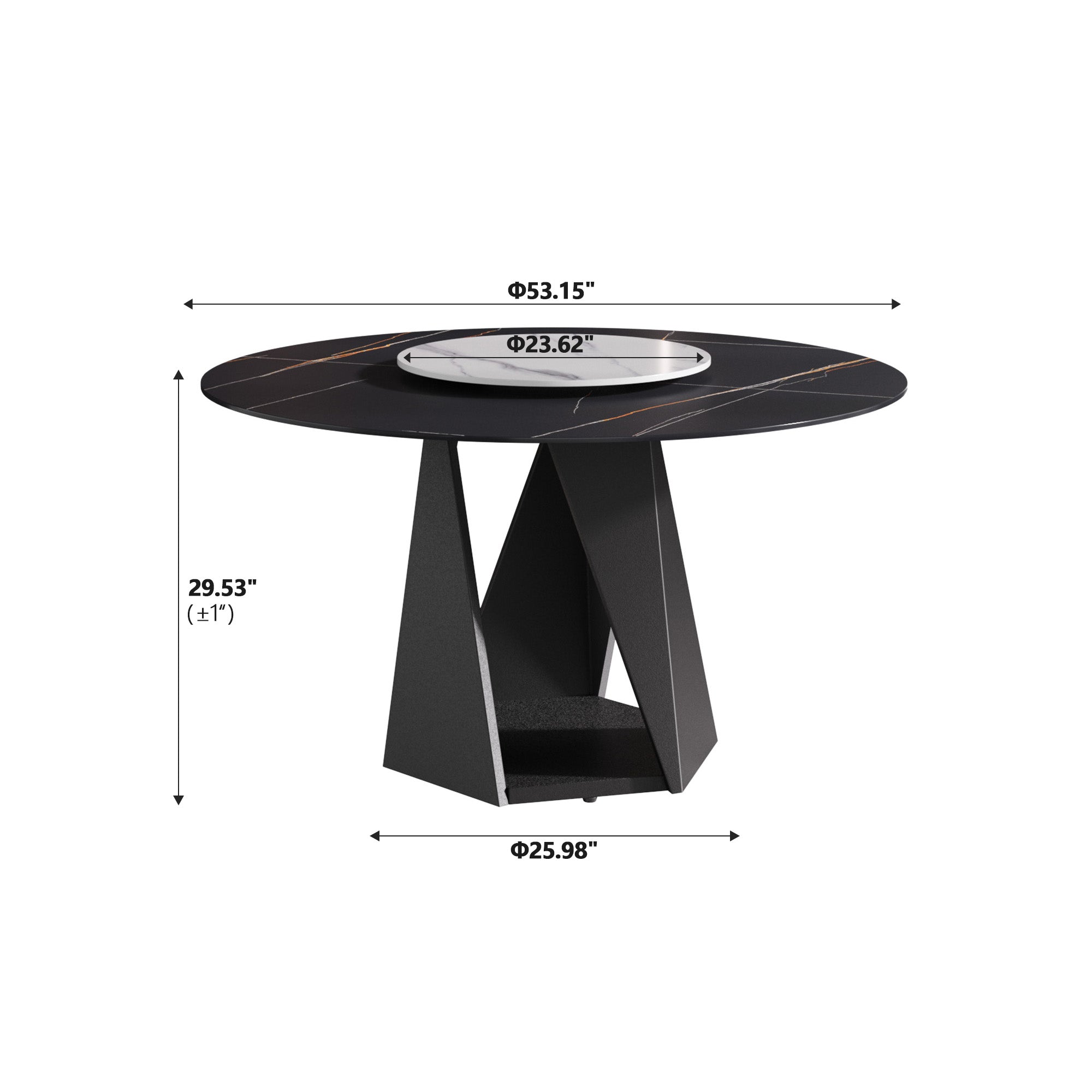Bring contemporary elegance and durable functionality to your dining area with this 53" round marble-look dining table. Designed to comfortably seat six, it pairs a striking white artificial sintered stone top with a sturdy black iron pedestal base for a clean, modern silhouette and reliable everyday performance. A 23.62" sintered stone turntable (Lazy Susan) adds convenience for serving, while the reinforced base supports heavy use and entertaining.