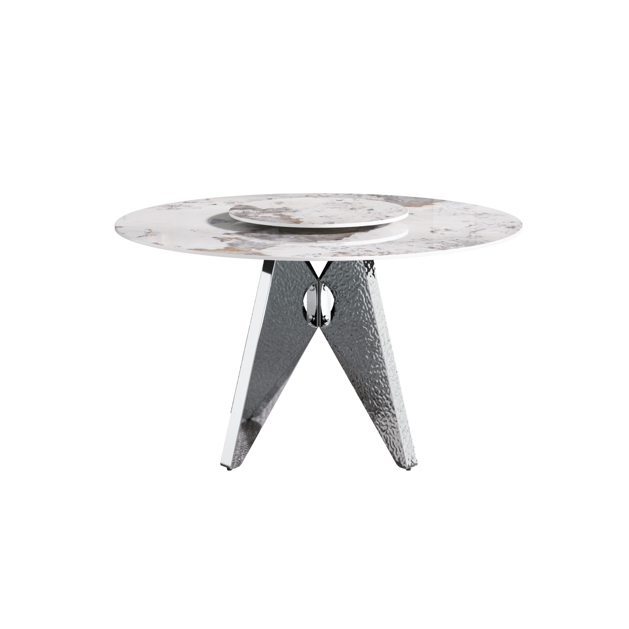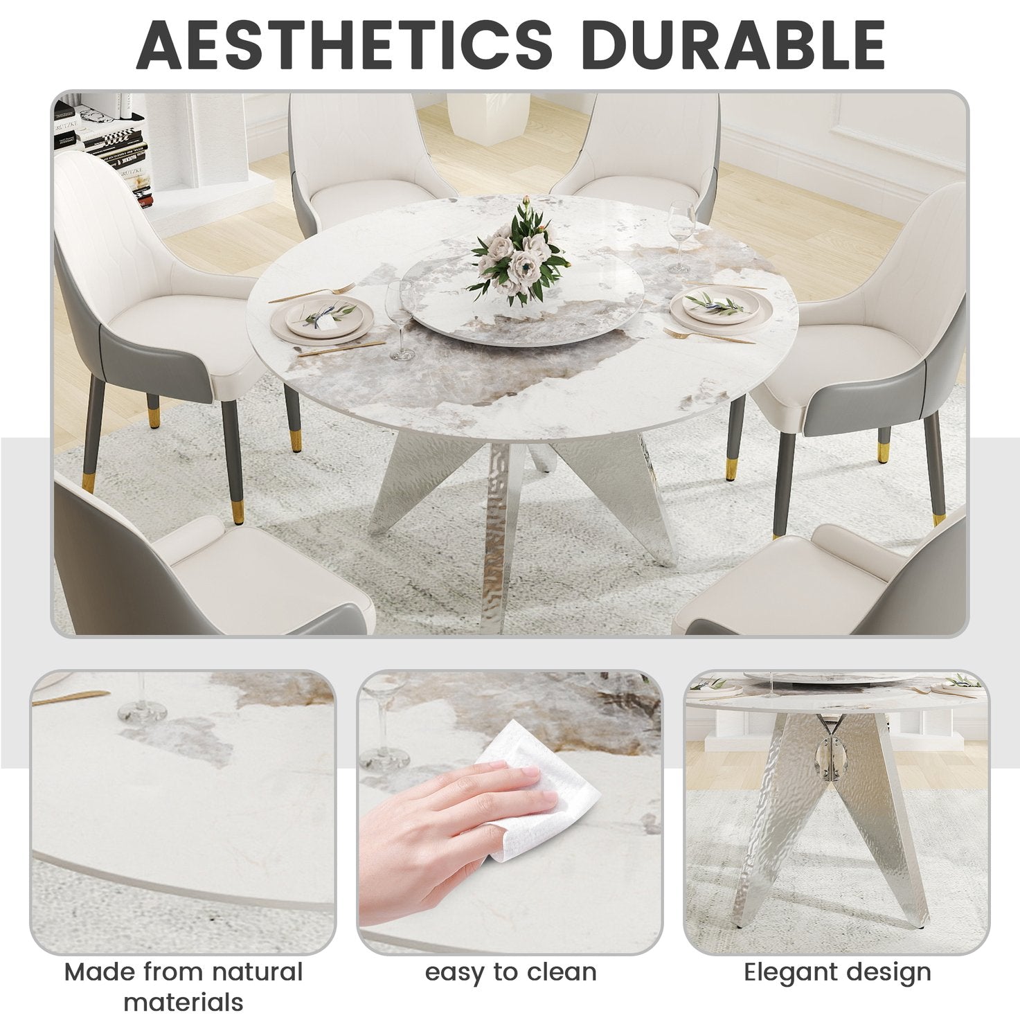 Bring modern elegance to your dining space with this 53" round dining table featuring a sleek silver stainless steel pedestal base and a durable white artificial marble (sintered stone) top. Designed to comfortably seat six, the table combines sculptural style with practical performance—including a 23.62" turntable—making it ideal for family meals, entertaining, or a contemporary dining room centerpiece.