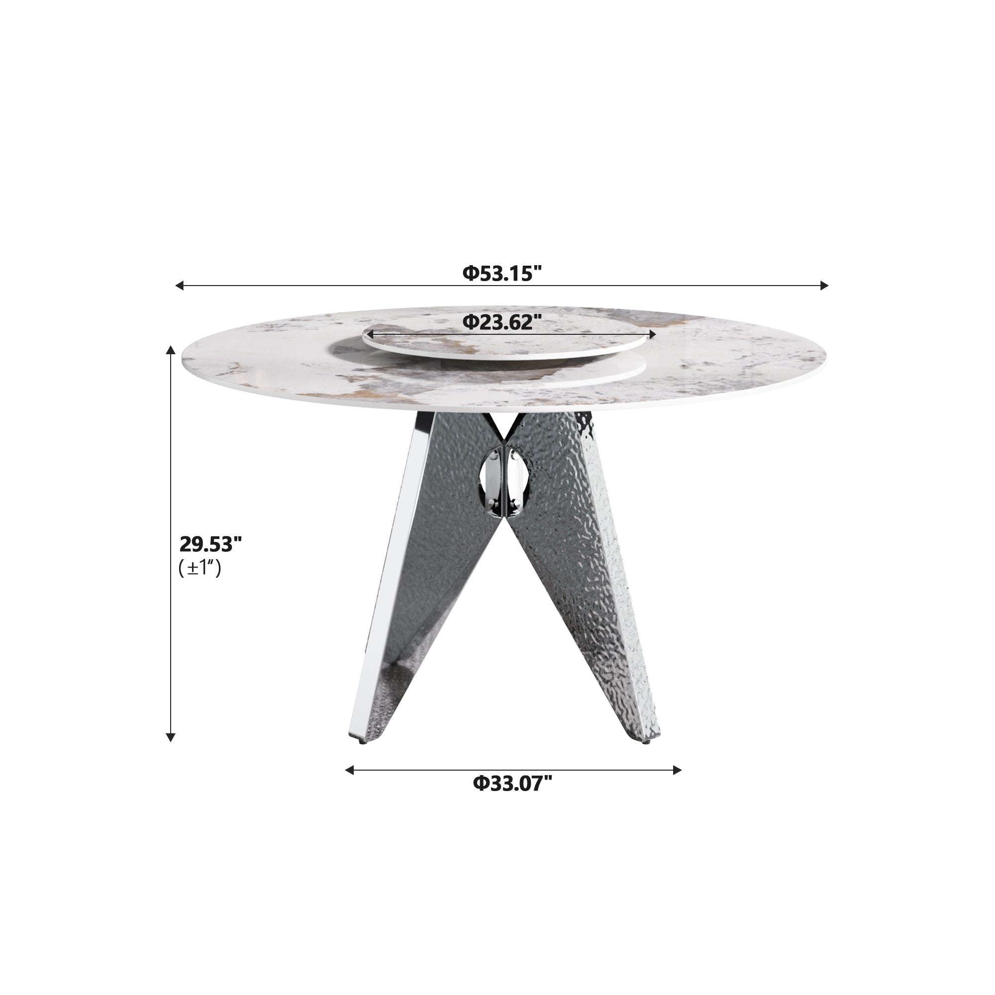 - Prominent Dimensions: Overall table size 29.53"H x 53"W x 53"L. Turntable diameter: 23.62"W. (Also listed as product dimensions: 60 L x 60 W x 7 H.)