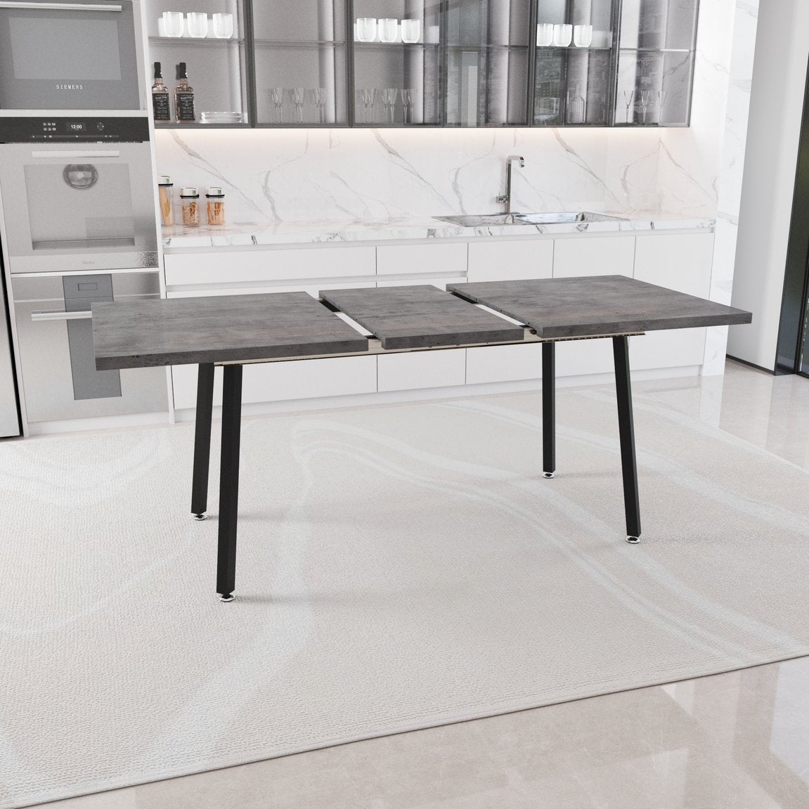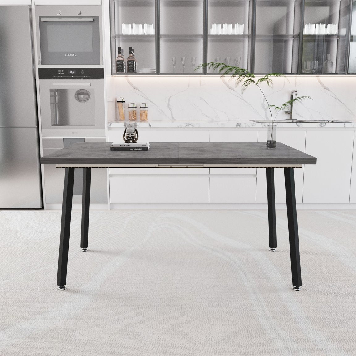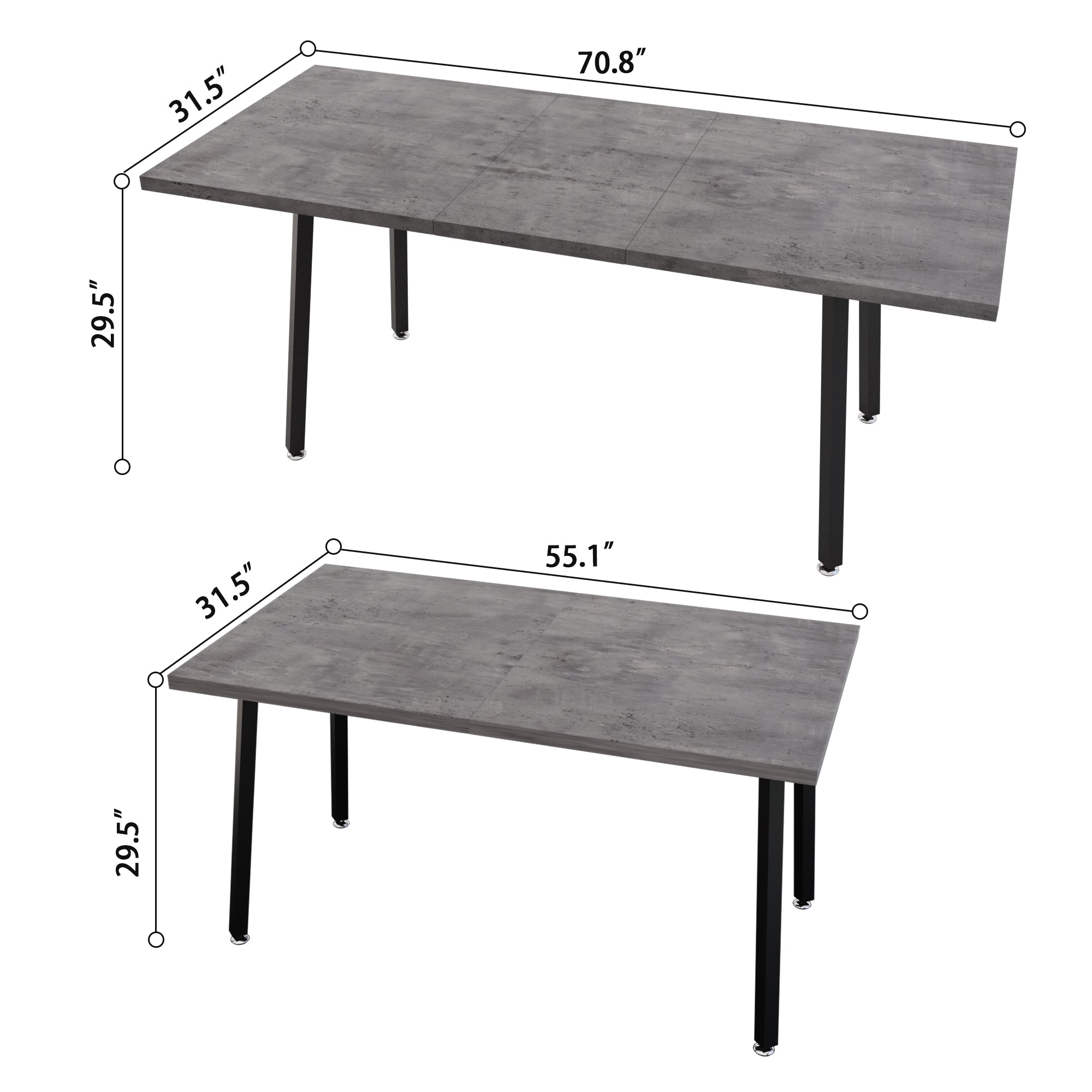 Bring modern farmhouse charm and everyday practicality to your dining space with this expandable rectangular dining table. Its textured gray MDF top and black metal legs combine a medieval-industrial aesthetic with durable construction, making it ideal for family meals, small gatherings, or a compact home workspace. Designed for easy cleaning and quick assembly, this table adapts from intimate dinners to seating for 4–6 people without sacrificing stability or style.