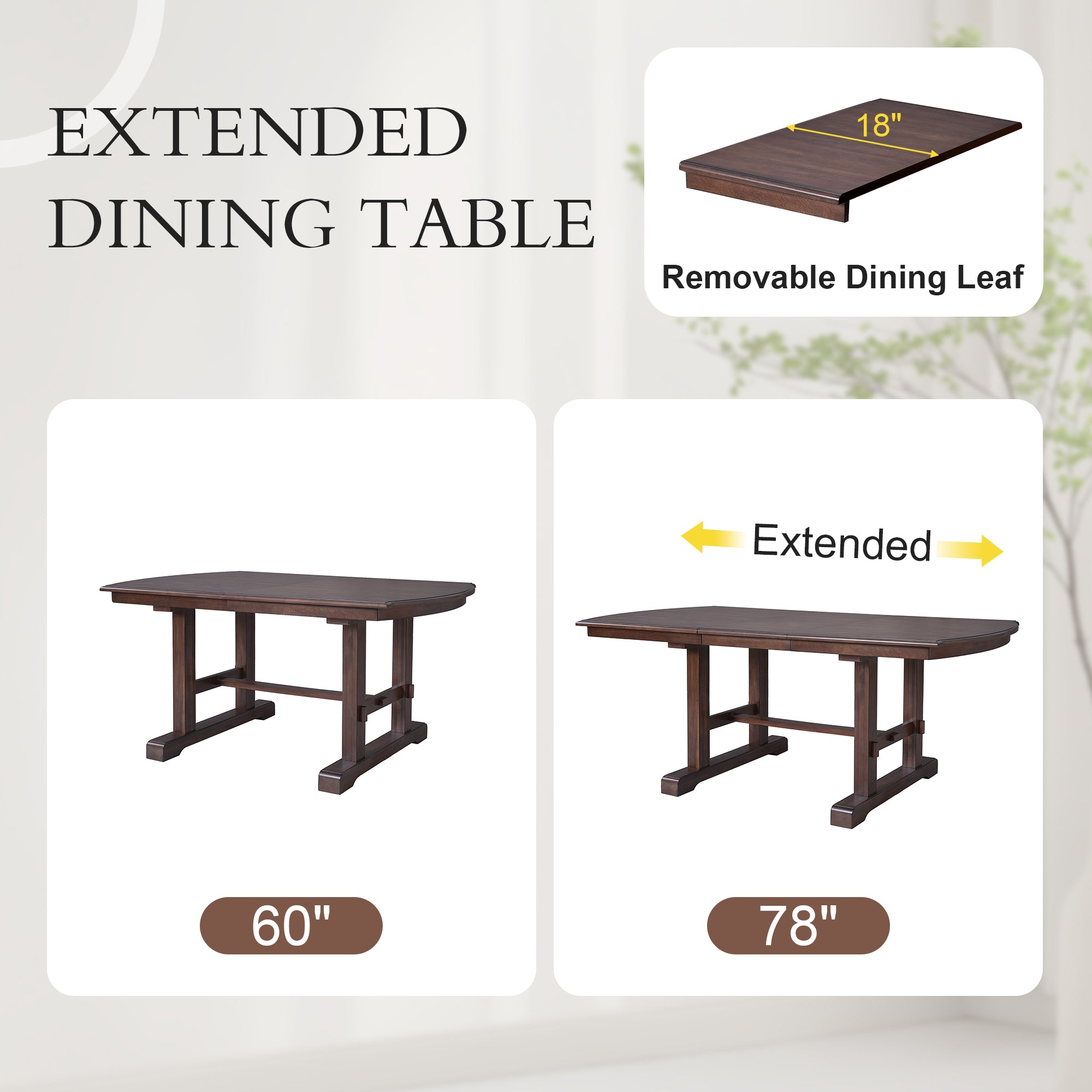 - MULTIFUNCTIONAL: This extendable dining table set is a classic addition to any home décor, the 18-inch removable dining leaf extends the table from 60 inches to 78 inches, comfortably seats 6-8 guests and adds more utility to your living space!