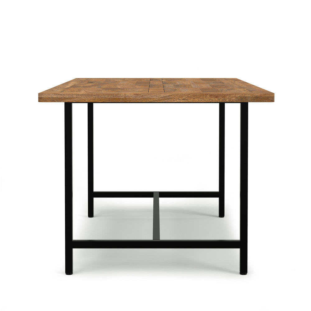 - Tabletop Construction: Thick tongue-and-groove panels assembled into a framed, grid-like pattern that highlights natural wood grain and texture.