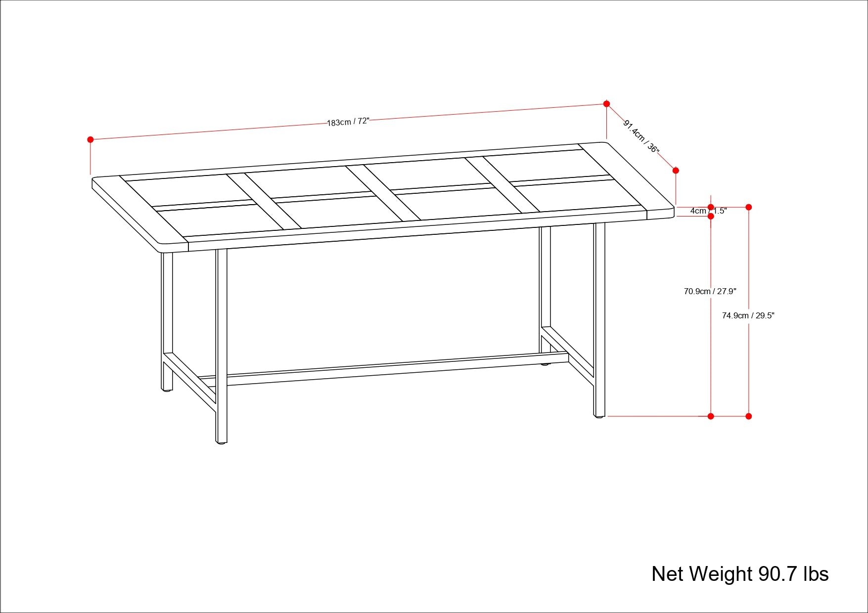 - Dimensions: 72 x 36 inches (tabletop); overall Product Dimensions: 77 L x 40.5 W x 14.5 H