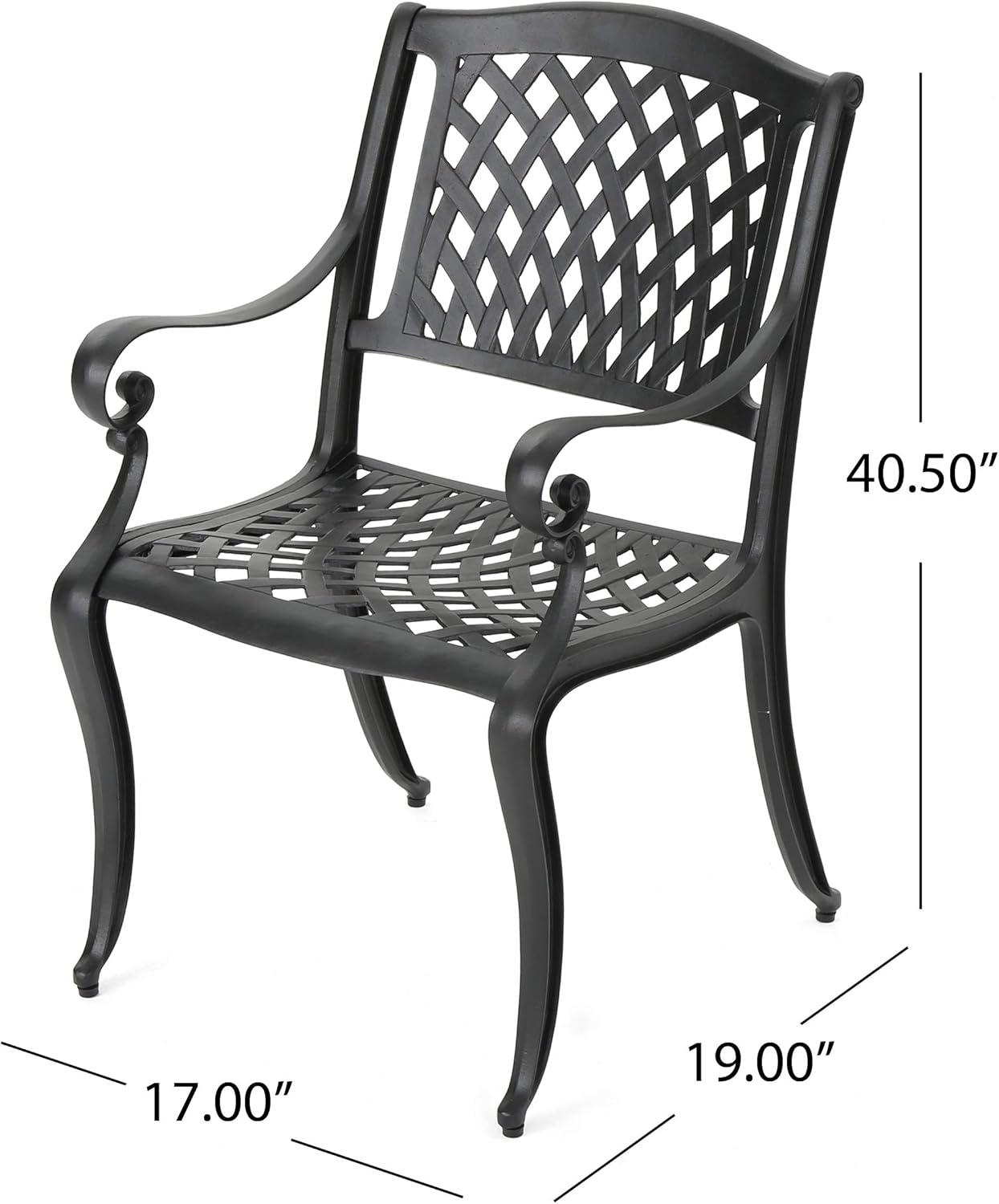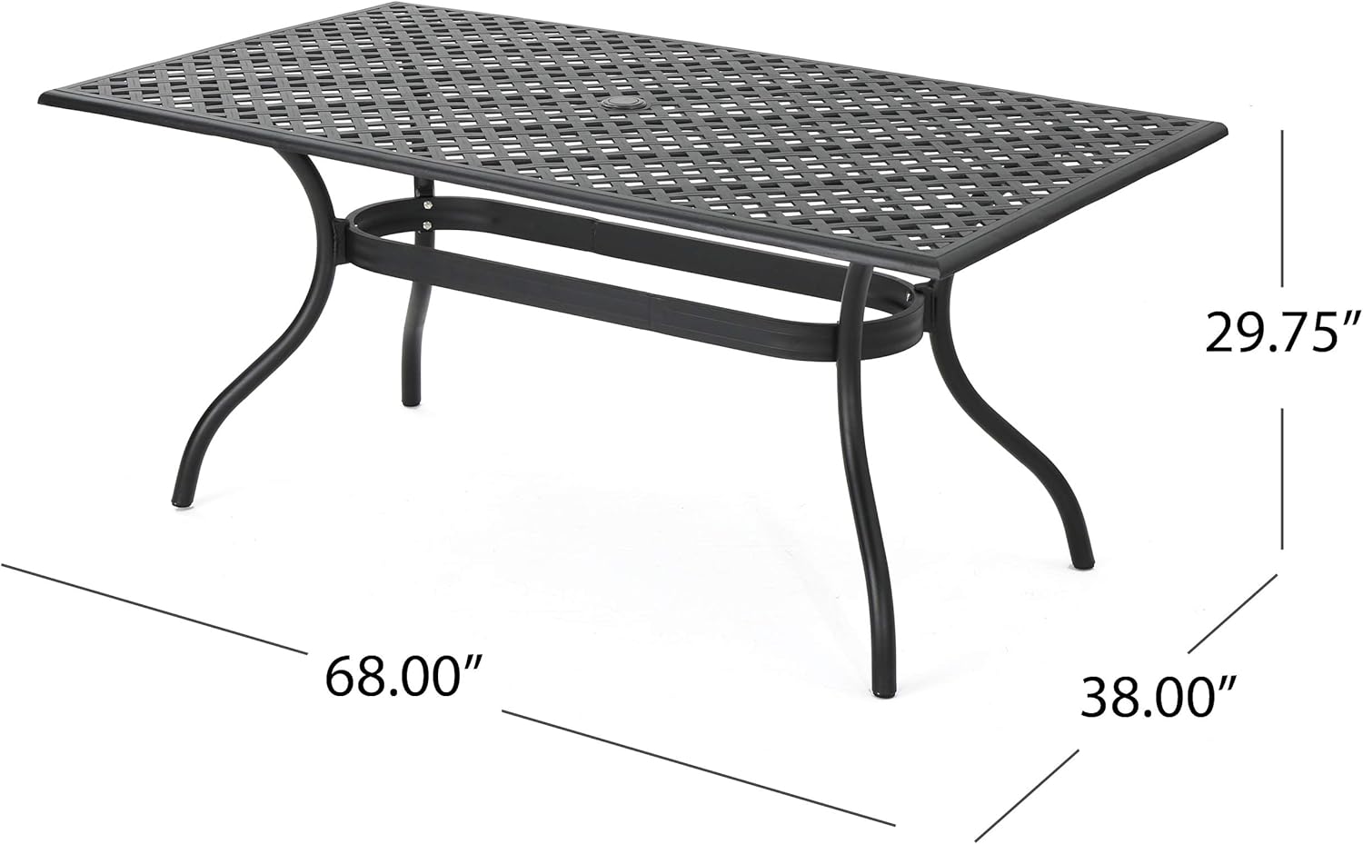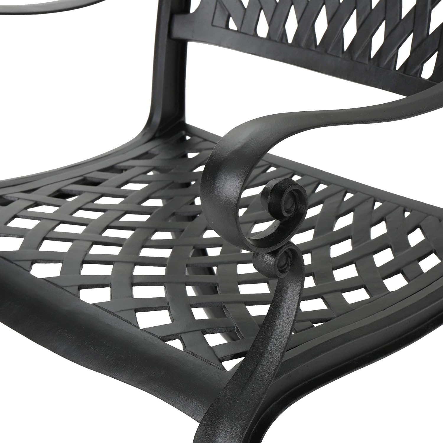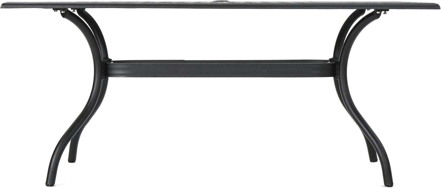 Bring timeless elegance to your outdoor dining area with the Calisa 6-person rectangular dining set. Crafted from rust-resistant cast aluminum and finished in classic black, this refined table pairs traditional lattice styling with durable construction to create a welcoming focal point for brunches, family dinners, or evening gatherings. Its graceful curved legs and clean woven-top pattern offer both visual appeal and long-lasting performance, suitable for patios, pergolas, and garden settings.