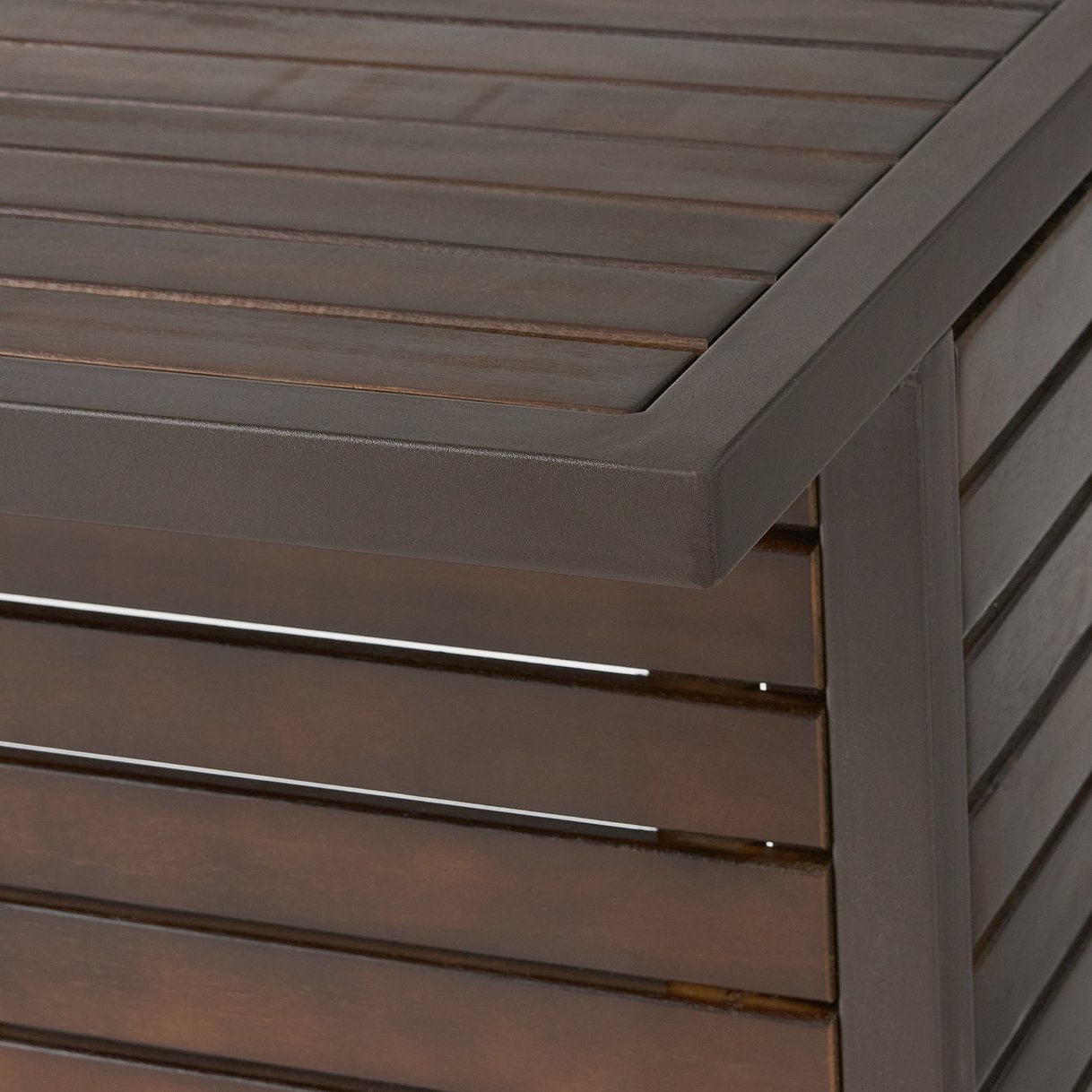 Bring the bar outdoors and entertain with style — this acacia wood bar table blends warm, natural grain with sturdy iron legs for a refined backyard centerpiece. Its slat panel design and dark brown finish create a timeless look that complements casual to contemporary outdoor settings, while rear shelving keeps glassware and bottles organized for effortless hosting.