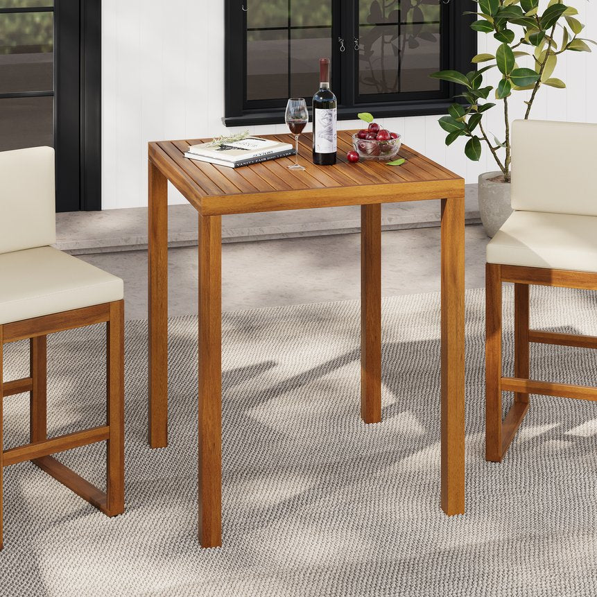 Add a touch of warm, natural charm to your indoor or outdoor entertaining area with this acacia wood bar table. Its clean, minimal silhouette and slatted tabletop create a casual yet refined focal point that complements contemporary, coastal, and rustic settings. Built from durable acacia with a light brown finish, the table is made to resist everyday use and outdoor conditions while remaining easy to care for.