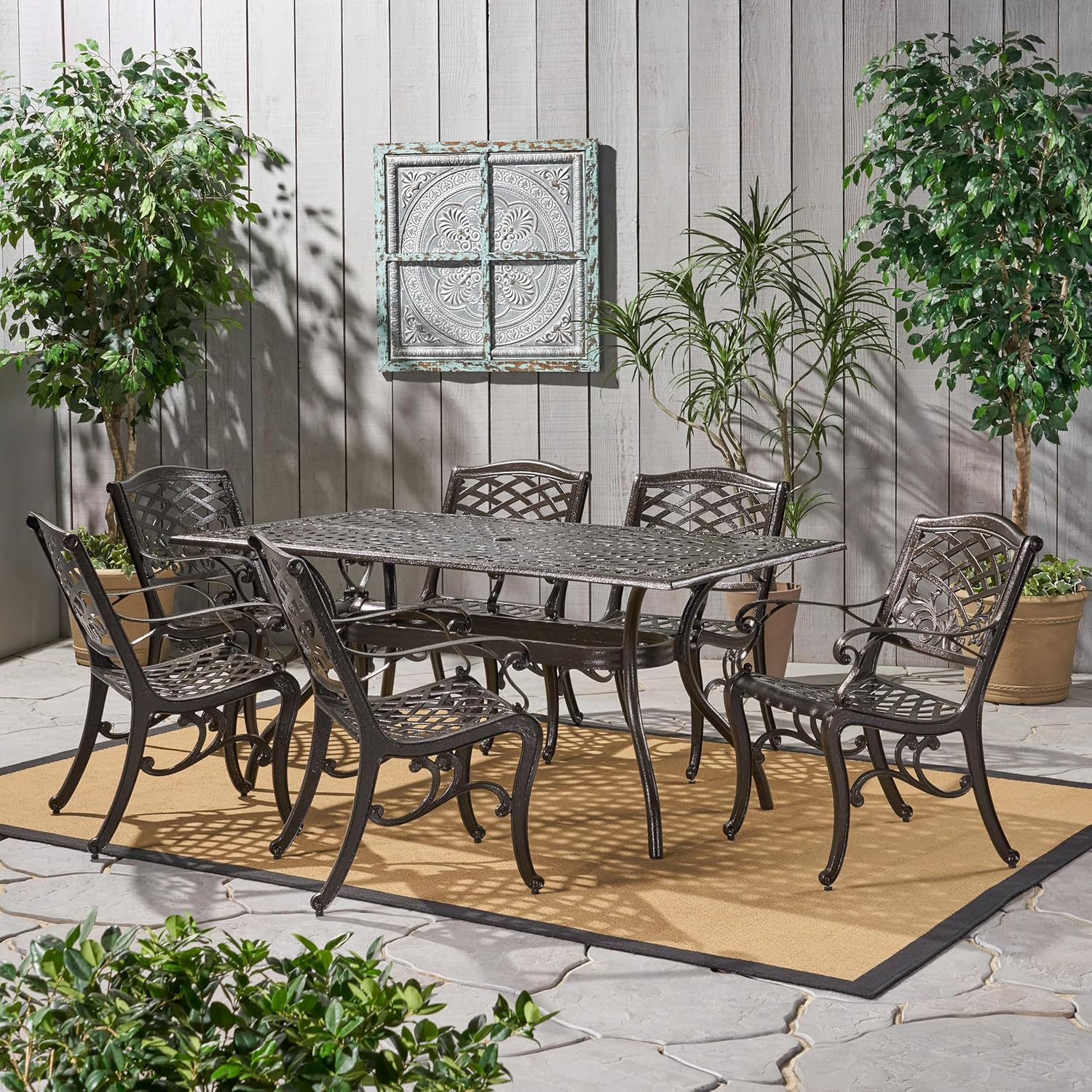 Bring classic elegance to your outdoor dining area with this beautifully crafted 6-person metal patio dining set. The cast-aluminum construction combines lightweight durability and rust resistance, while a detailed floral lattice tabletop and graceful saber legs create a timeless, refined look ideal for casual family meals or formal alfresco entertaining.
