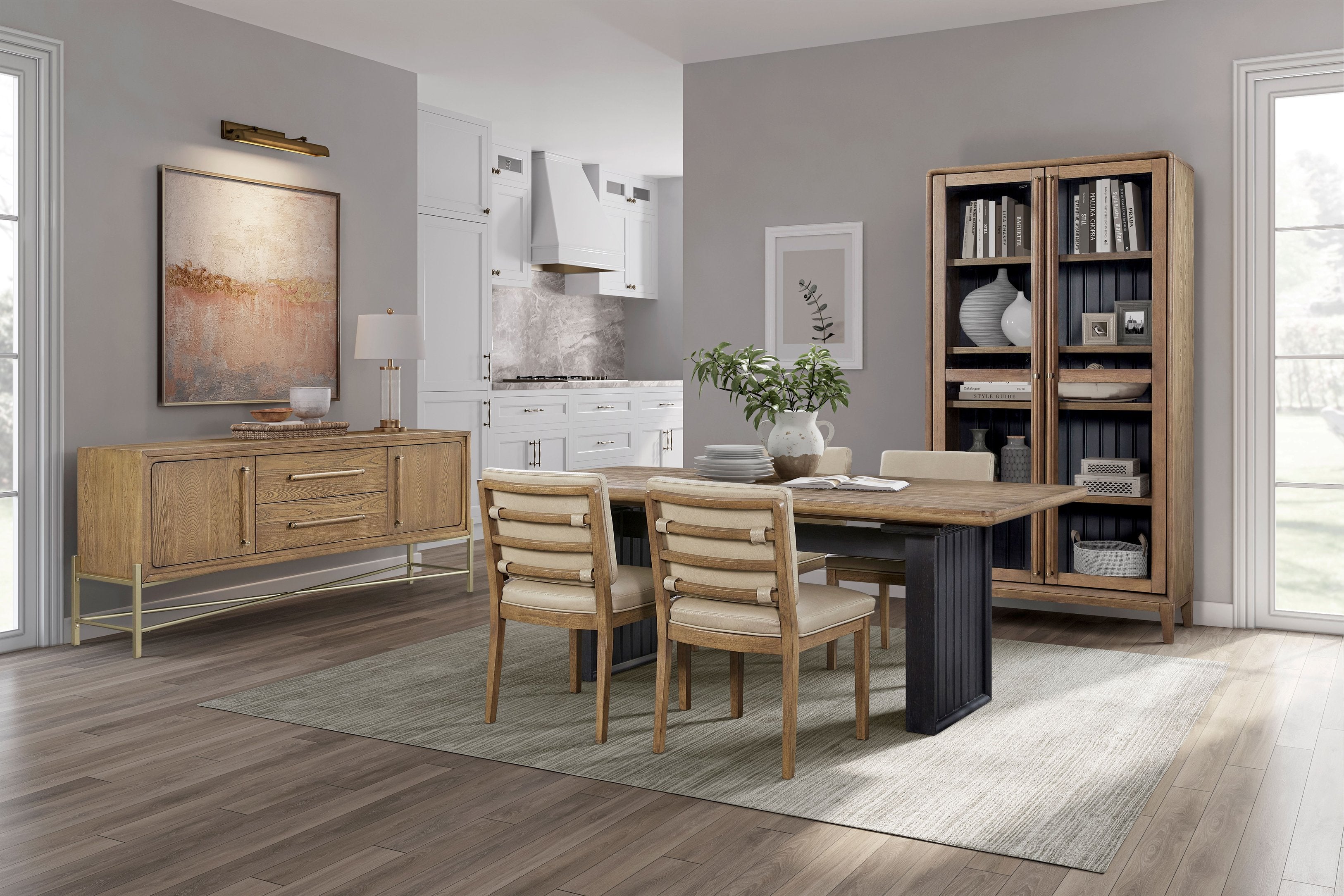 Bring timeless elegance and versatile function to your dining space with this double pedestal table in a warm latte finish. Crafted with a blend of solid wood and MDF and finished with fine elm veneers, it combines durability with refined styling—perfect for everyday meals or entertaining guests.