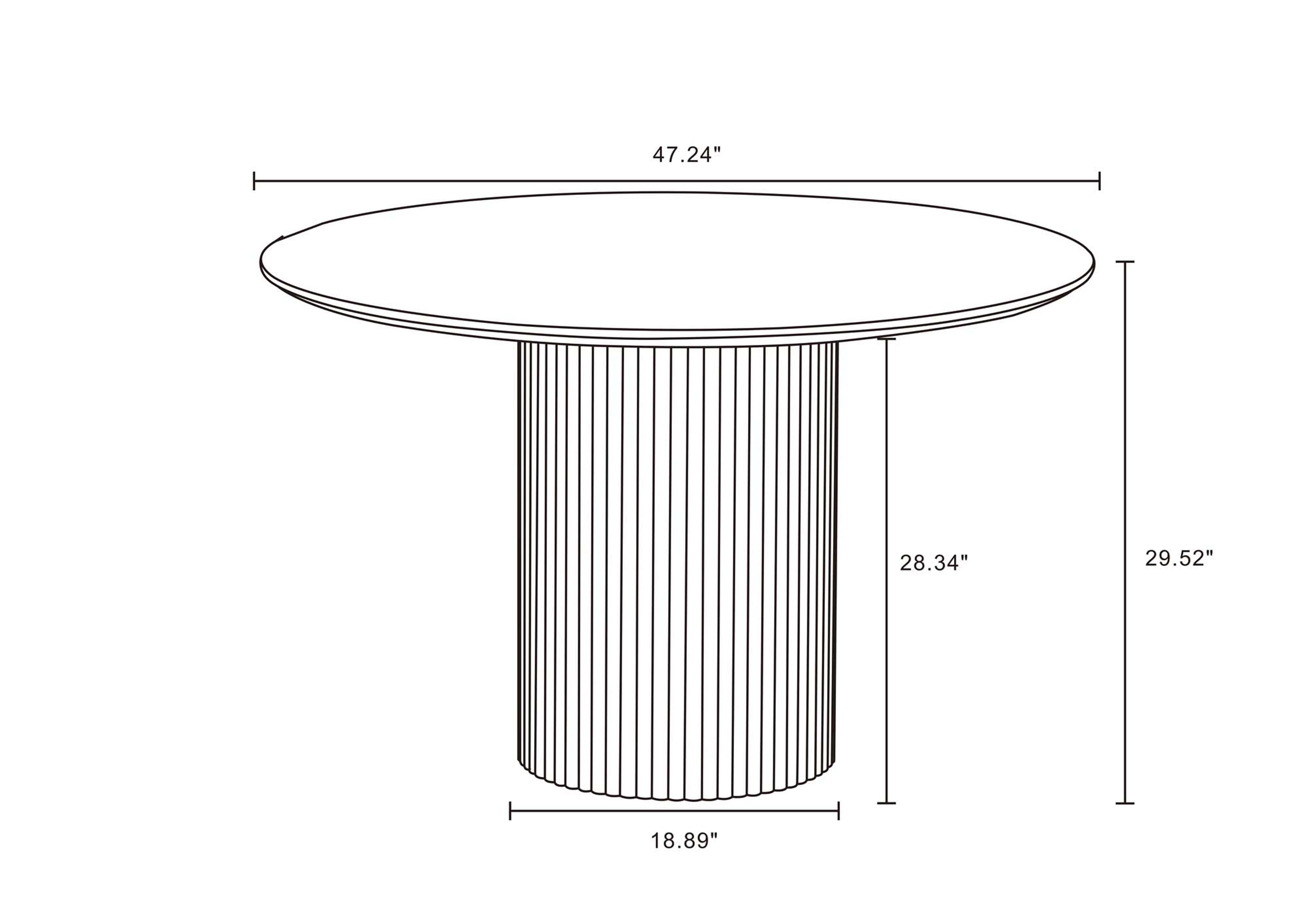 - Upon assembly, Round Dining Table Dimensions Measure: 47.24 in. Length, 29.52 in. Height, 47.24 in. Depth.