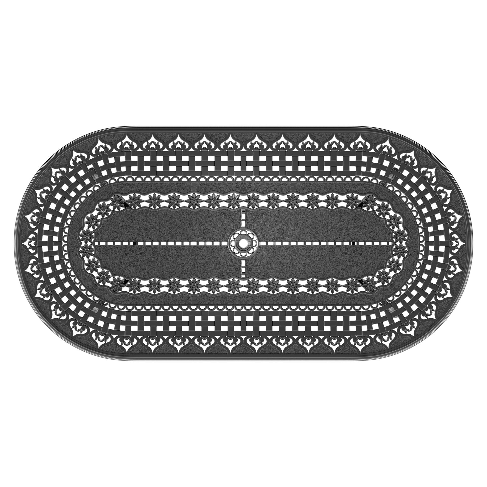 Invite guests to dine outdoors in comfort and style with this durable cast aluminum patio dining table. Its sleek black frame and oval top provide a modern focal point for your patio, deck, or garden, while the built-in umbrella hole offers convenient shade options. Designed to seat up to eight, this table balances sturdy construction with refined aesthetics to complement both casual and formal outdoor settings.