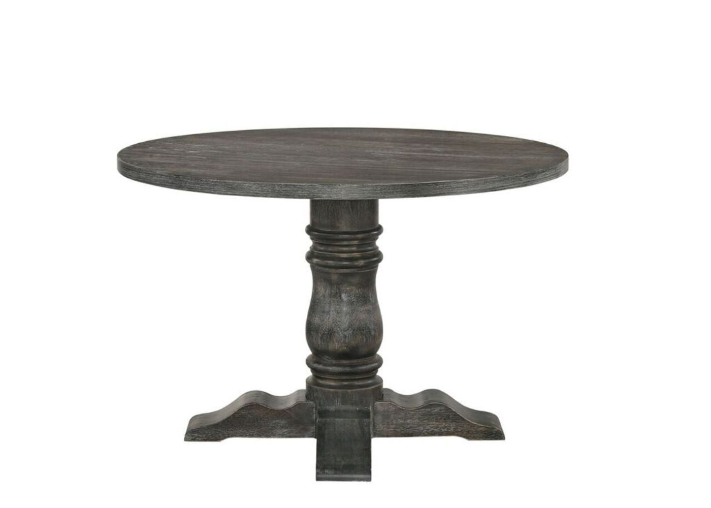- This beautifully crafted dining table in weathered gray exudes rustic charm with its round, single pedestal design and timeless appeal.