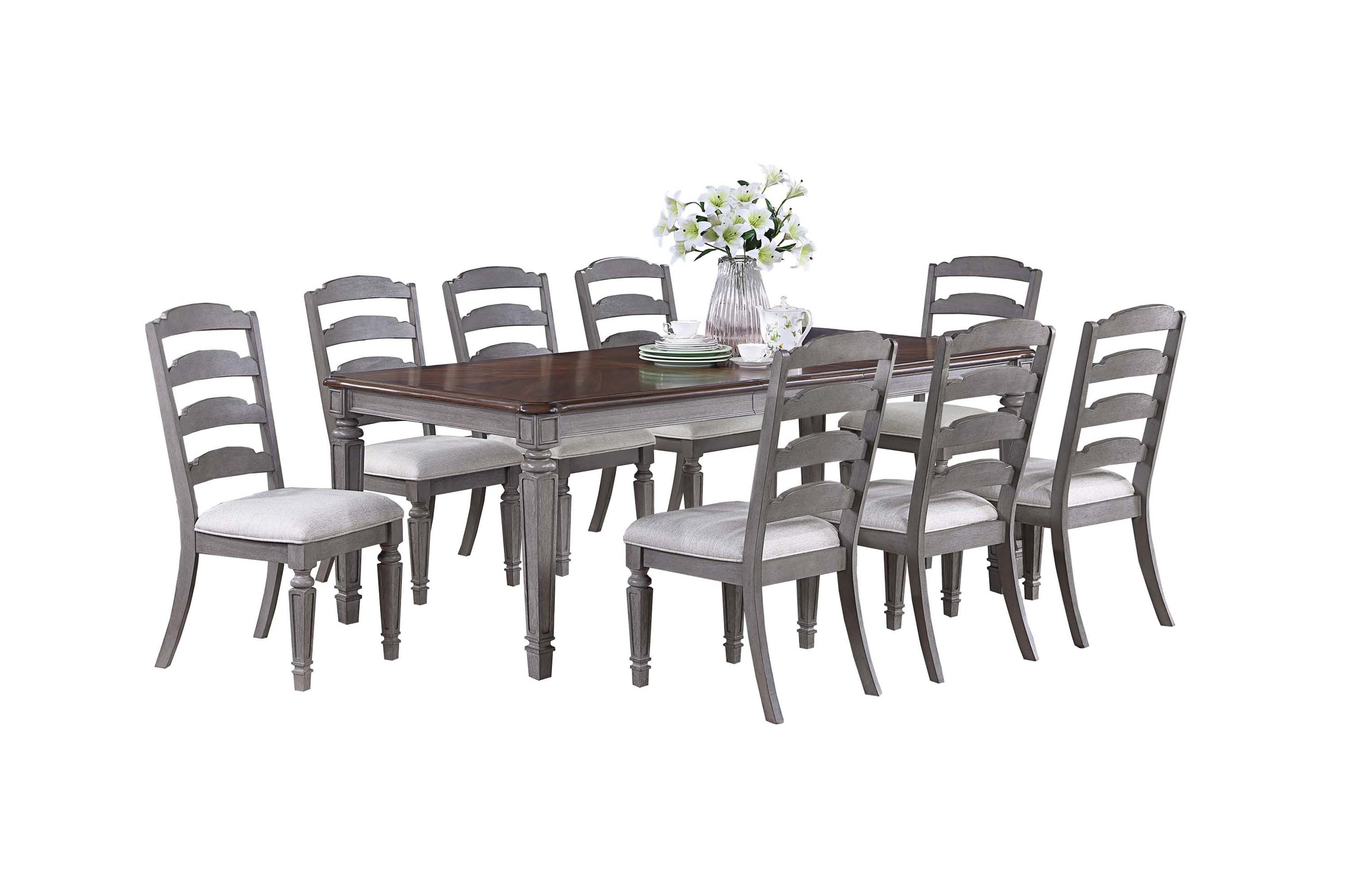 Bring warmth and contemporary charm to your dining room with this light grey and cherry dining table—designed for entertaining, built for everyday use. Its contrasting tabletop and base, carved tapered legs, and extendable leaf make it an elegant focal point for family meals and special gatherings. Pair with coordinating chairs (sold separately) to complete a cohesive dining set.