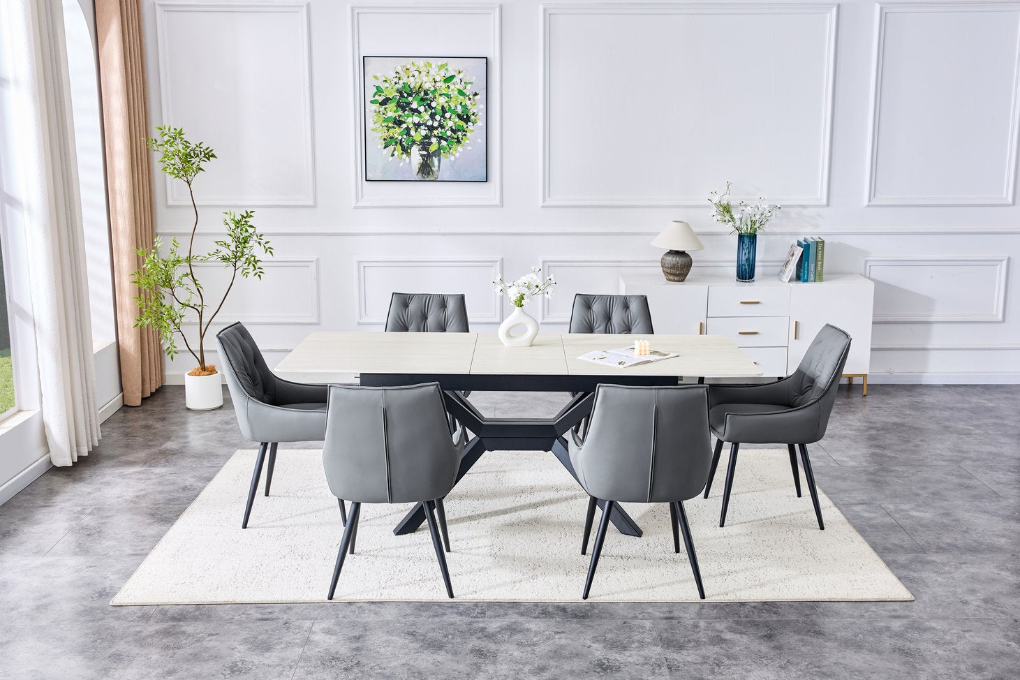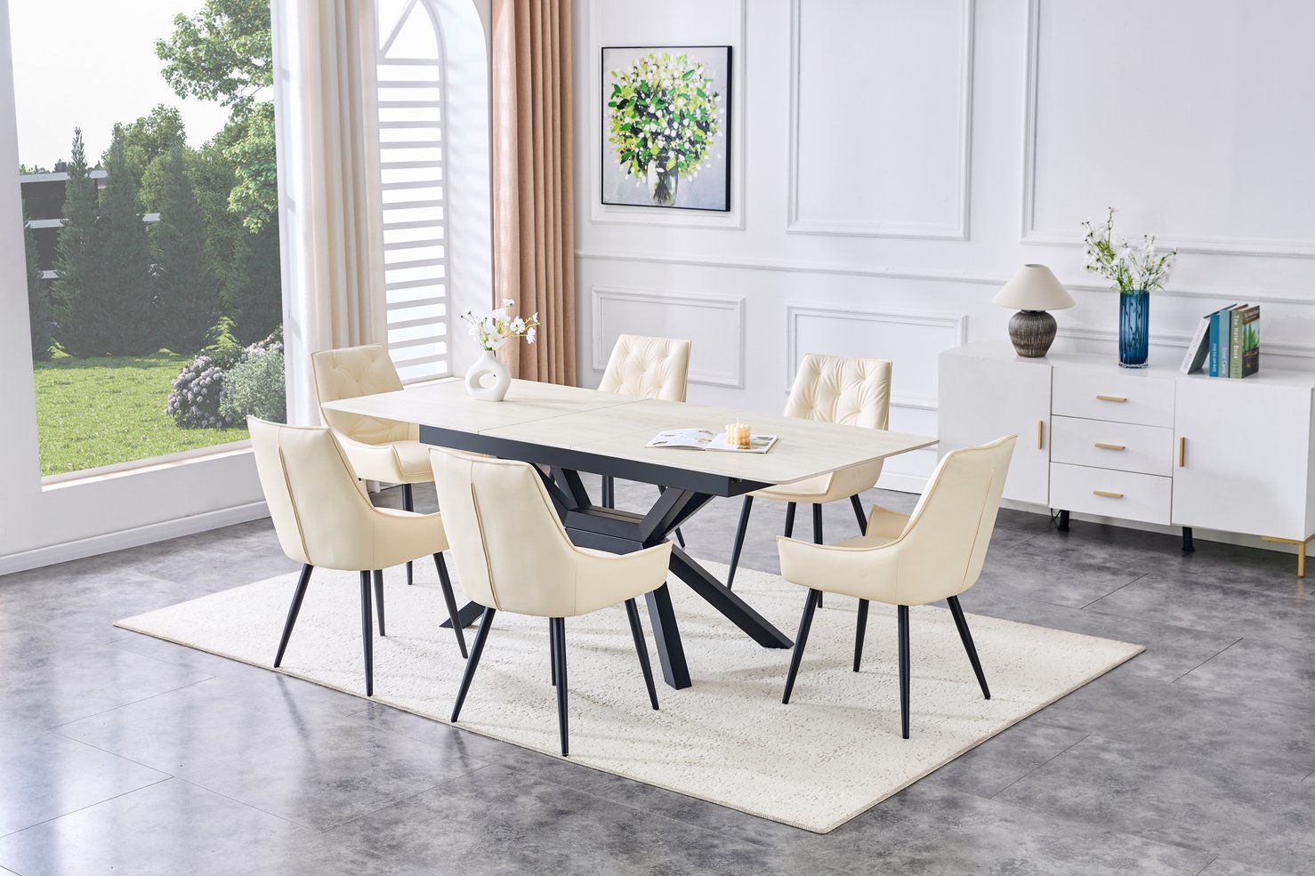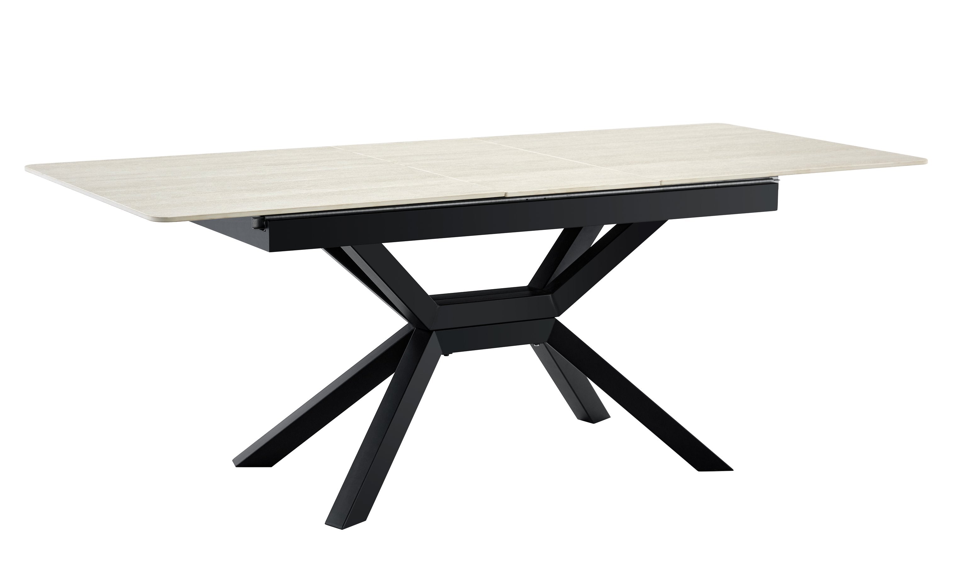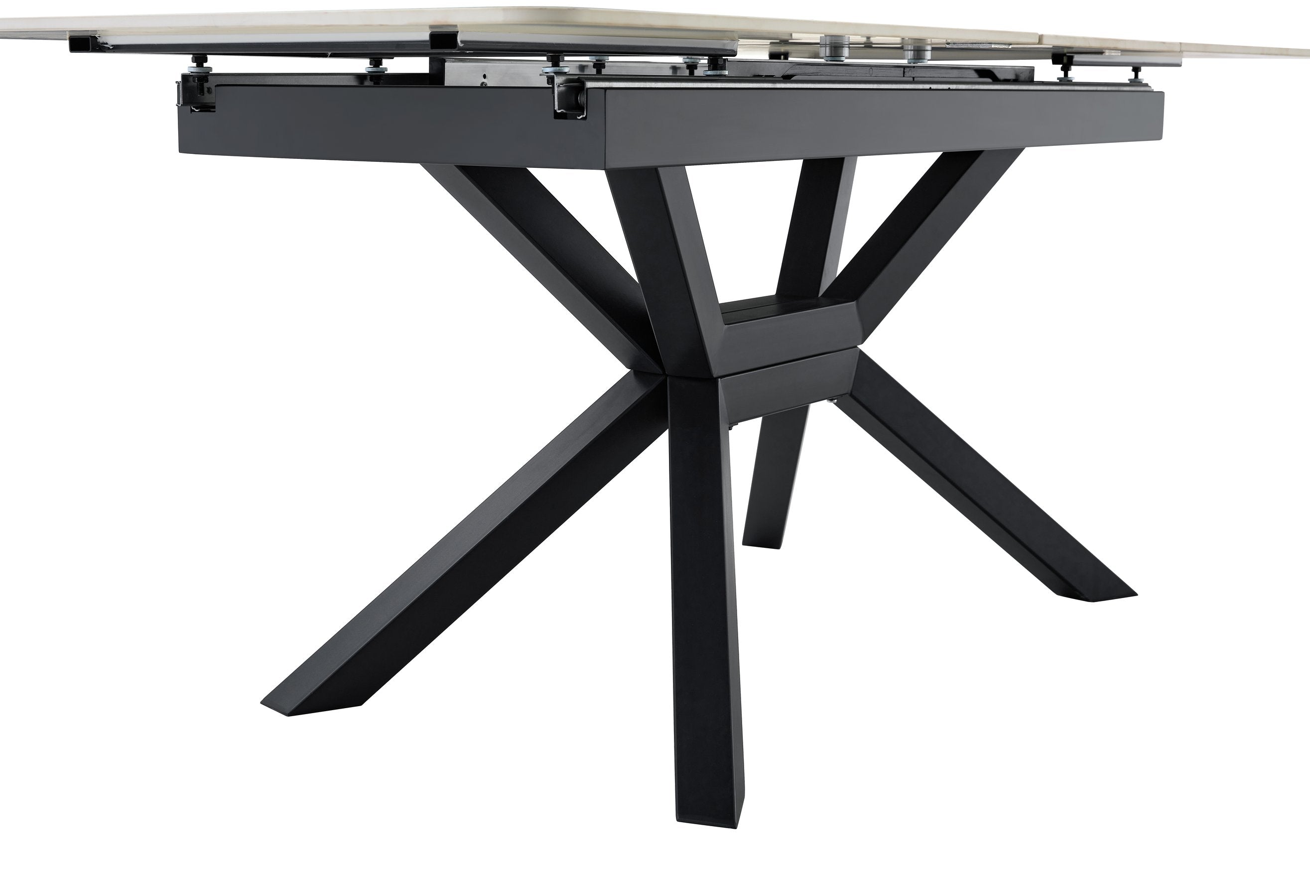 Bring contemporary elegance and practical versatility to your home or office with this modern extendable dining table. Crafted for everyday use and entertaining, it pairs a durable sintered stone tabletop with a geometric X-frame metal base for a clean, architectural look that fits dining rooms, kitchens, breakfast nooks, or meeting areas. The smooth, easy-care surface and reliable extendable mechanism make it ideal for compact living or expanding to accommodate guests.