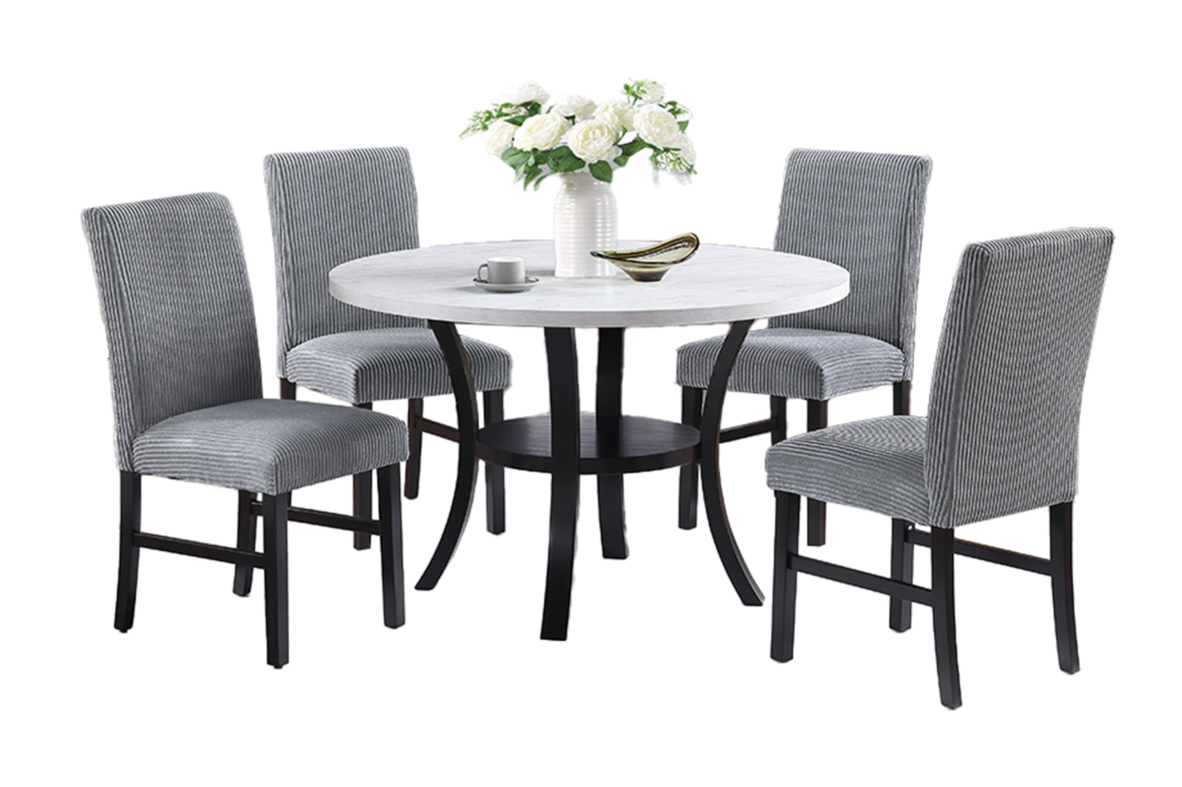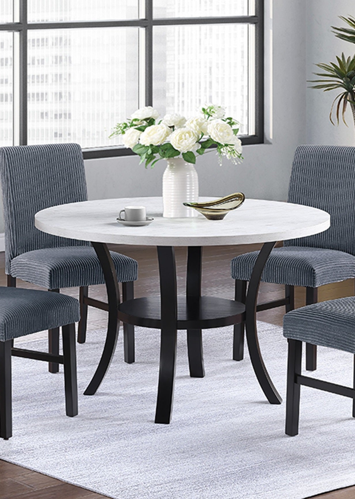 Bring modern elegance to your dining space with this round dining table that blends clean lines and practical design. Its crisp white top and sculptural black curved legs create a striking contrast, while the open lower shelf adds useful storage without sacrificing style. Comfortable for up to four people, this table is ideal for everyday meals or intimate gatherings and pairs well with a variety of chair styles (chairs sold separately).