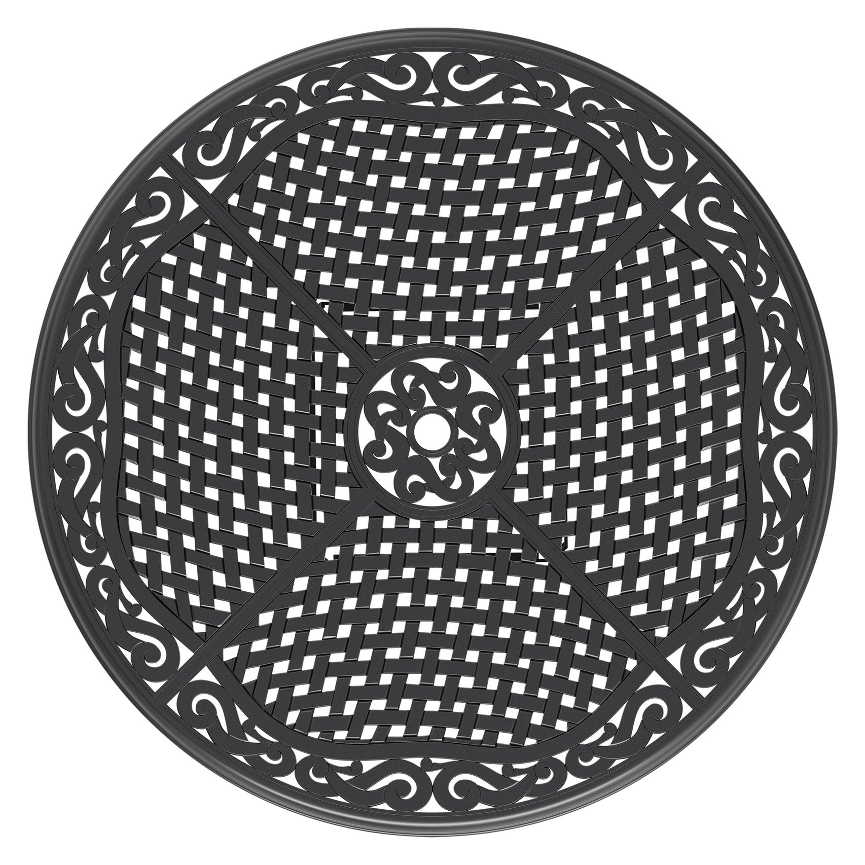 Bring timeless outdoor dining to your patio with this 48-inch round cast aluminum table. Built for durability and easy maintenance, its sleek black finish and integrated umbrella hole make it a practical centerpiece for family meals or entertaining guests. Lightweight yet sturdy, the table resists rust and weathering while supporting comfortable seating for up to six.