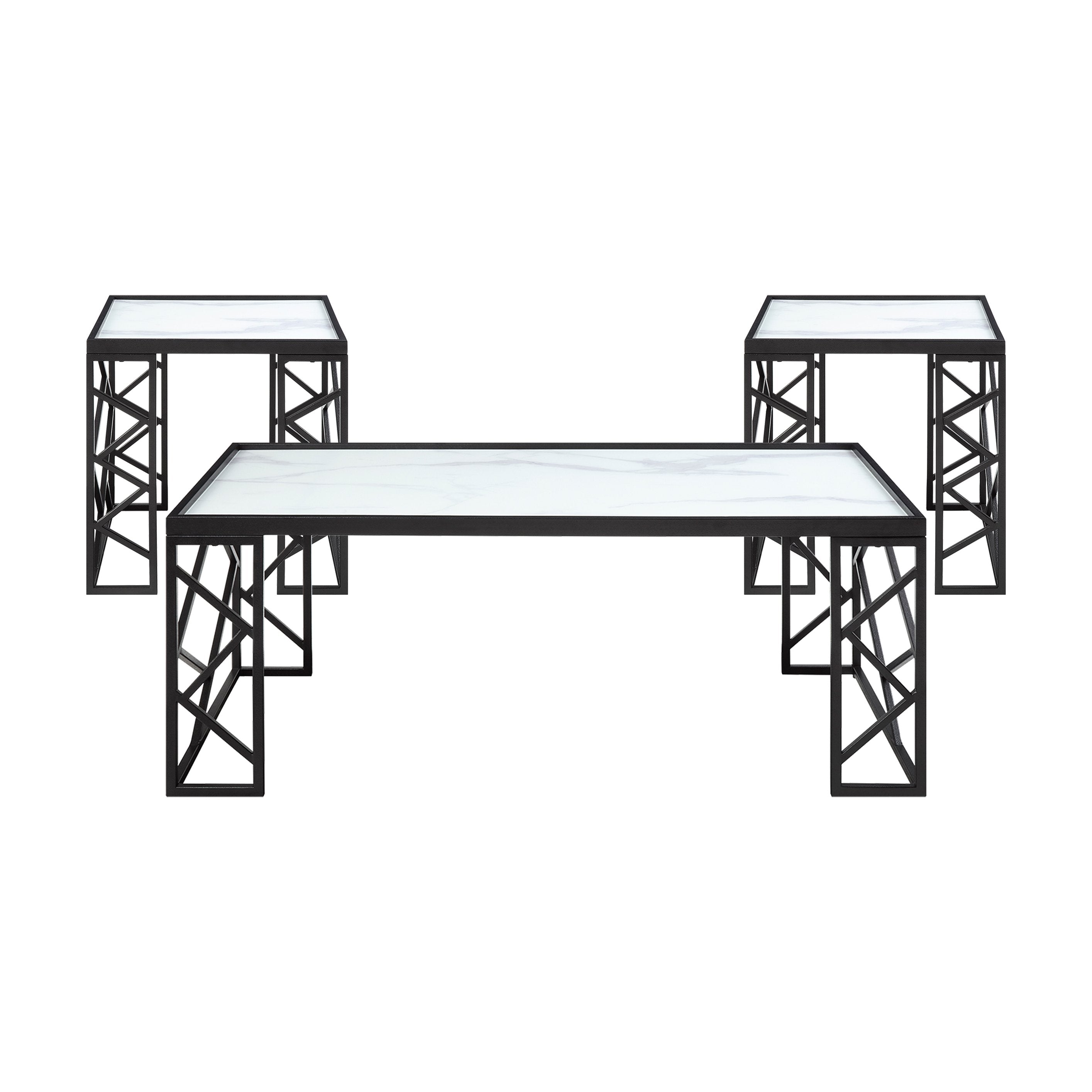 Elevate your living room with the Astral 3-piece occasional table set—an elegant blend of modern geometry and classic marble aesthetics. Clean black metal frames and white marble-print tempered glass tops deliver a striking contrast that suits contemporary and transitional interiors. This set includes one cocktail table and two end tables, offering coordinated functionality for entertaining or everyday use with a light, airy visual footprint.