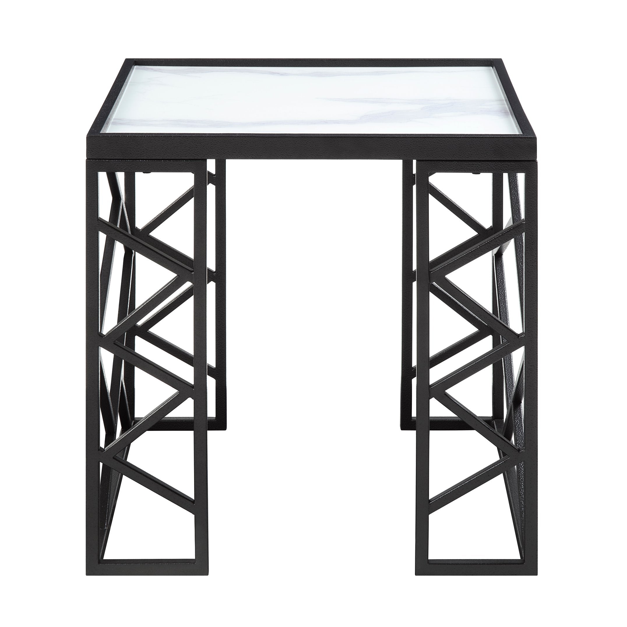 - Design: Black metal frame with intersecting lines for a modern, architectural look; white marble-print tempered-glass tops for a sophisticated marble appearance without the weight or maintenance of real stone.