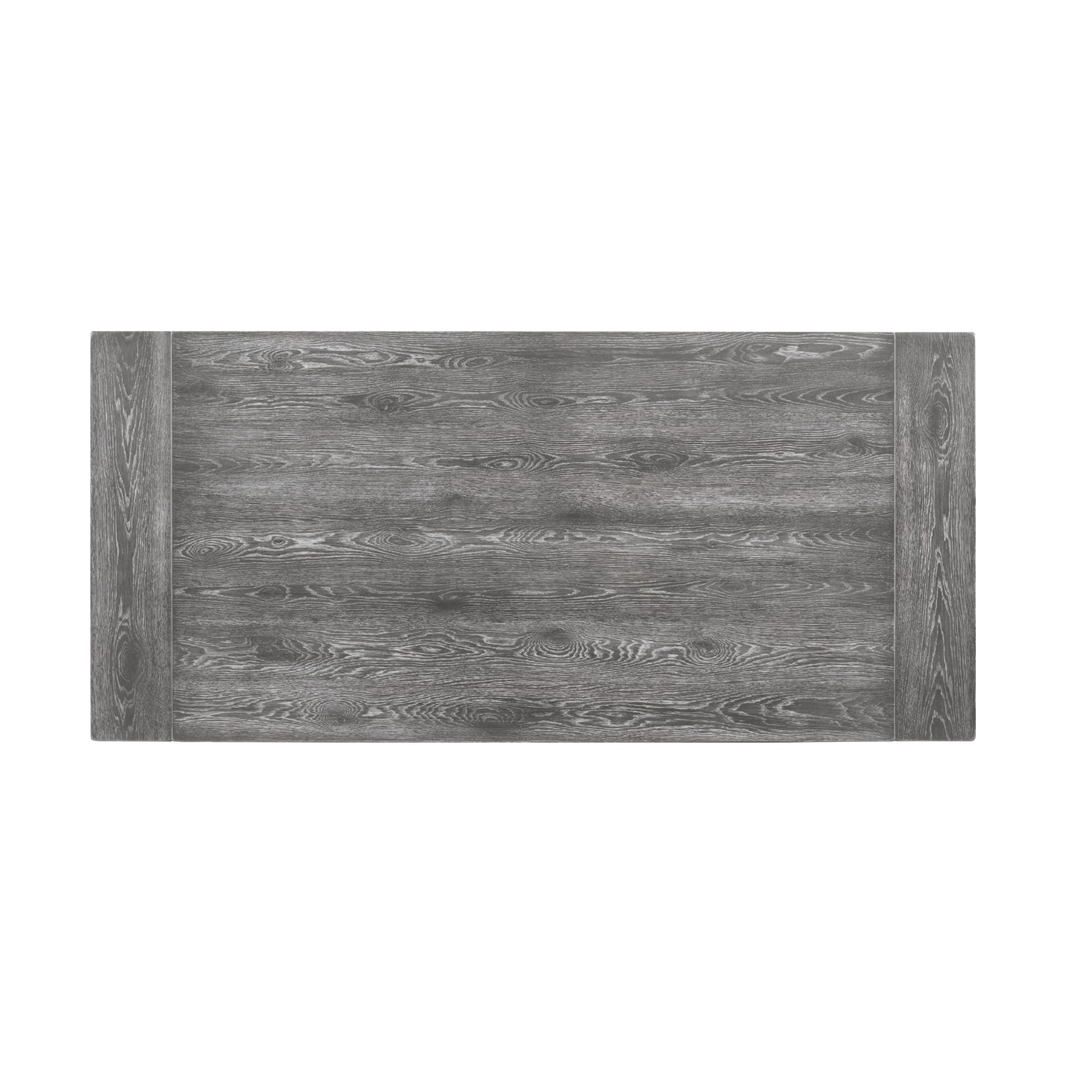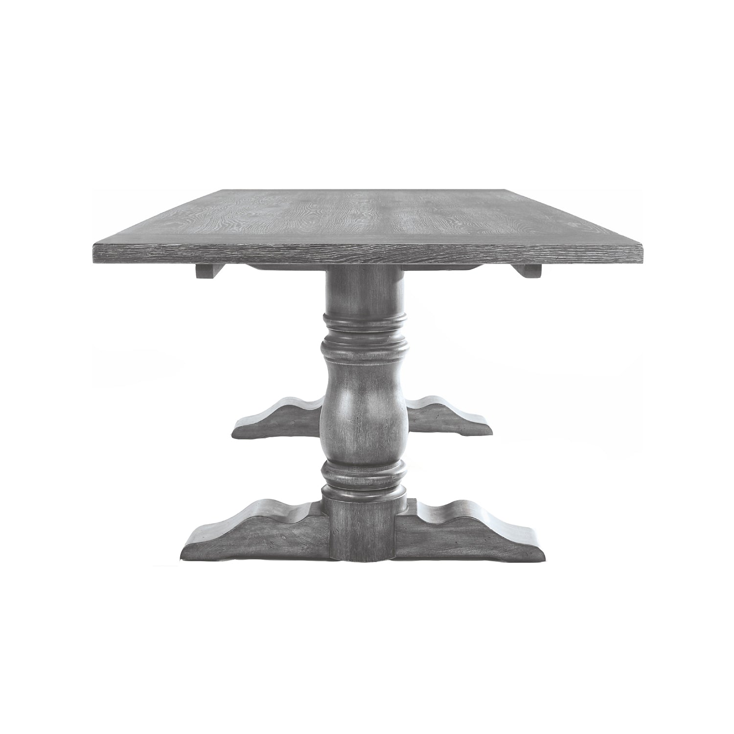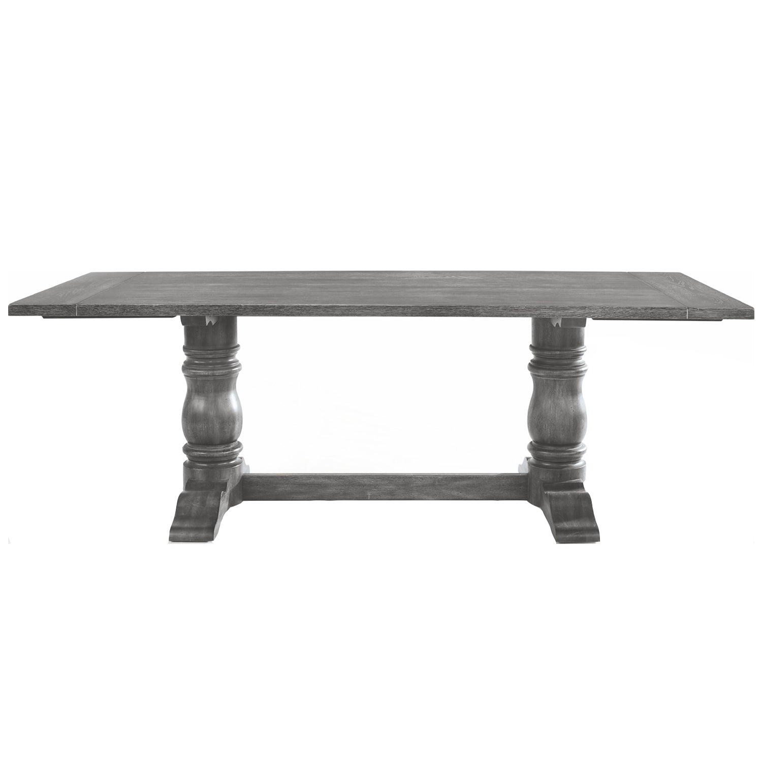 Bring rustic charm and sturdy craftsmanship to your dining space with this rectangular trestle table. Its weathered gray finish and double-turned pedestal supports create a timeless, farmhouse-inspired look while offering a durable, functional surface for everyday meals and entertaining.