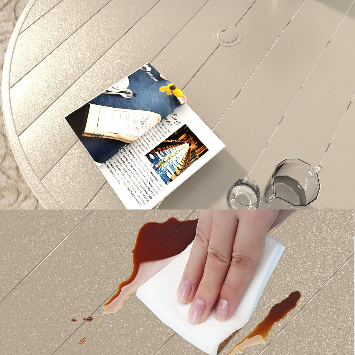 - Weather Resistant: Designed to withstand sun exposure without cracking or burning like some wood or untreated metal tabletops.