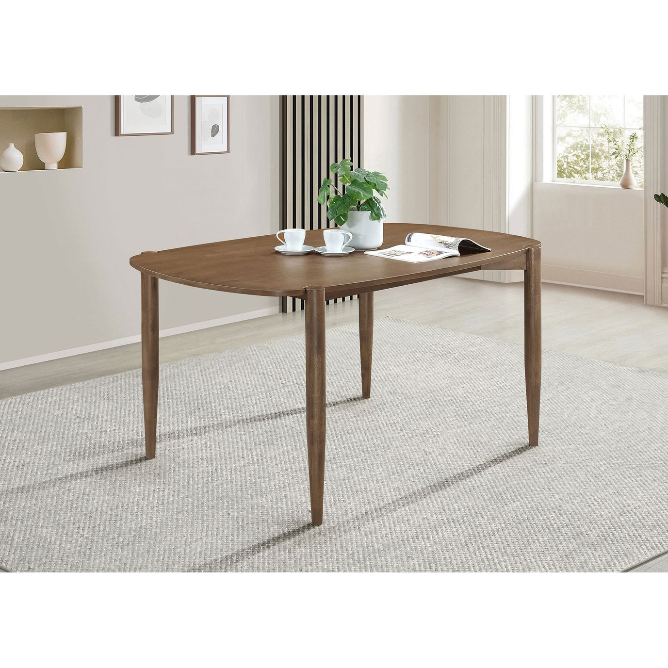 Elevate your dining space with a beautifully balanced piece that blends organic curves and clean lines. This walnut-finish solid wood dining table pairs sculptural form with everyday function—its gently rounded rectangular top and tapering legs create a refined, inviting silhouette that works seamlessly in modern, transitional, or mid-century inspired interiors.