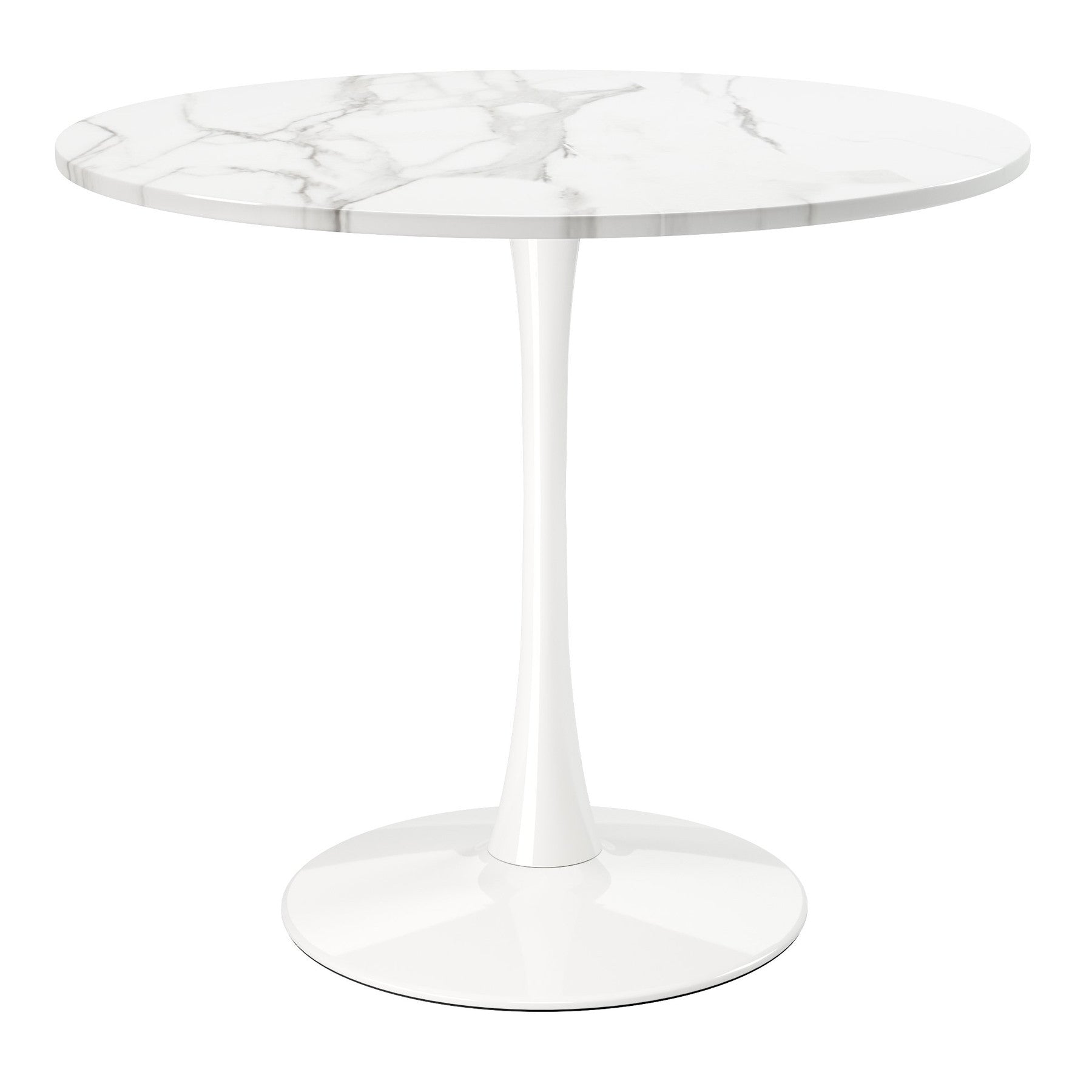 - Sleek and chic white with white marble finish round pedestal dining table.