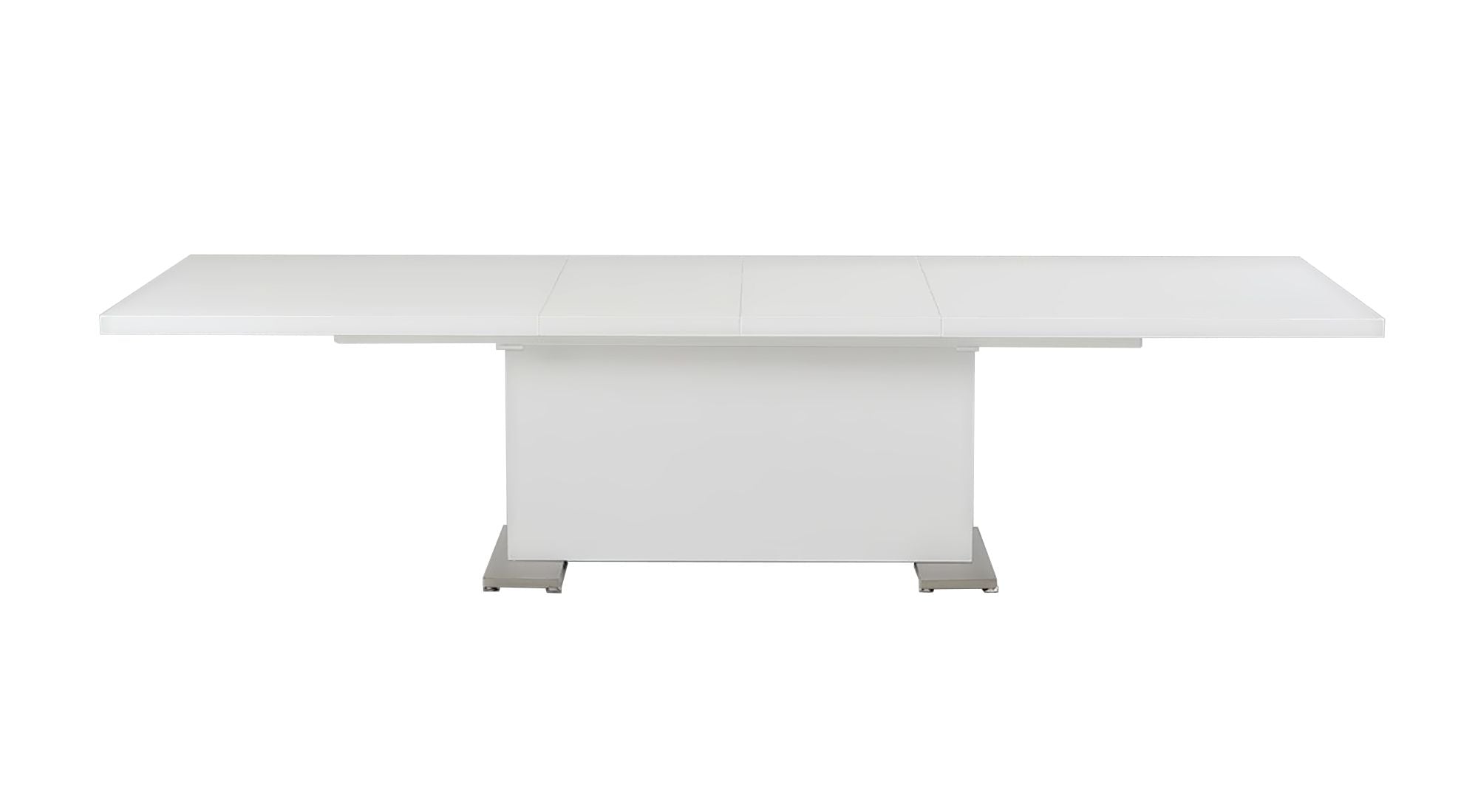 - Rectangular dining table with a folding mechanism and a glossy white finish.