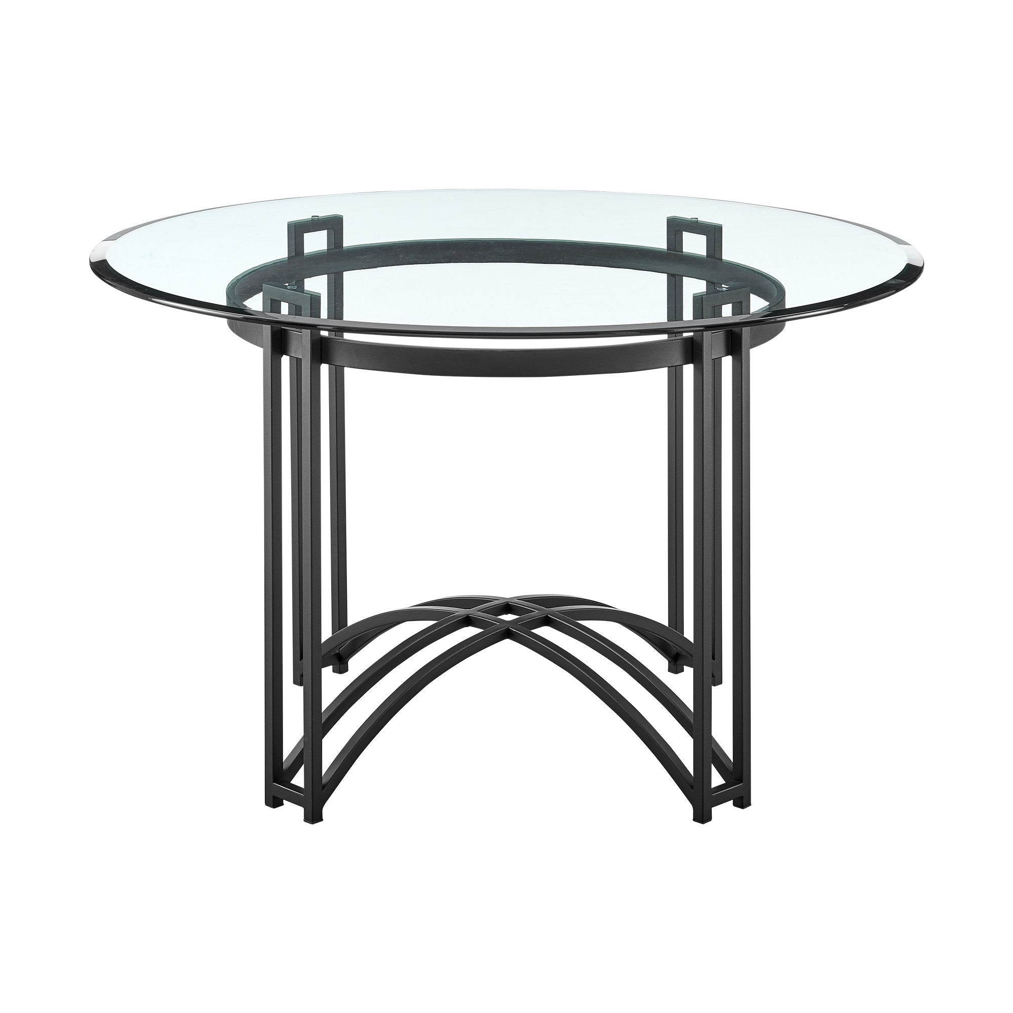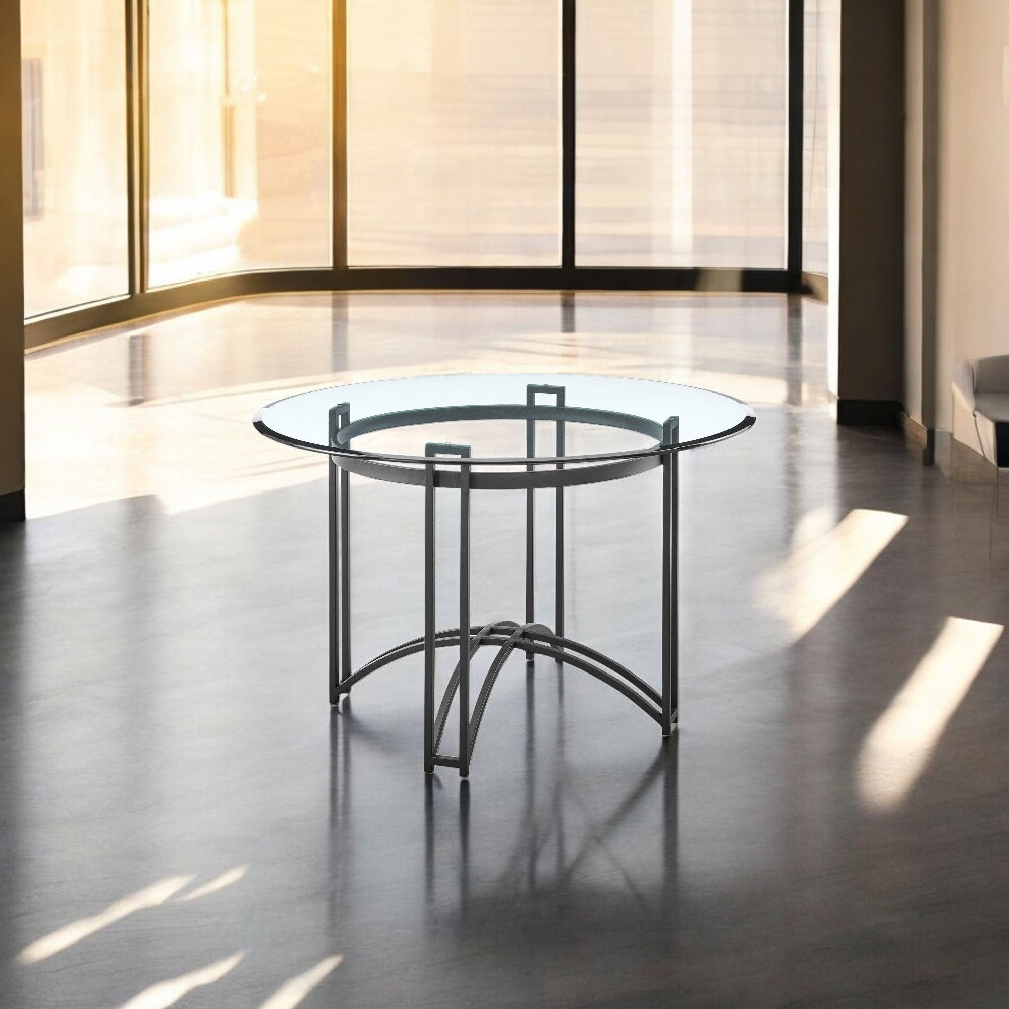 Enjoy making memories around this gorgeous 48-inch clear and black glass and iron round top dining table. Quality construction from the black iron base combines with clear glass of the top to give this table a fresh and updated two-tone look. Add a touch of modern design to your space with this easy to wipe clean glass top dining table. Seat up to 4 family and friends around your new dining table. Complete your kitchen or dining room with this well made and stylish table. This eye-catching dining table is ready for you to enjoy breakfast for one or entertain your guests. 29.5-inch H x 48-inch W x 48-inch D