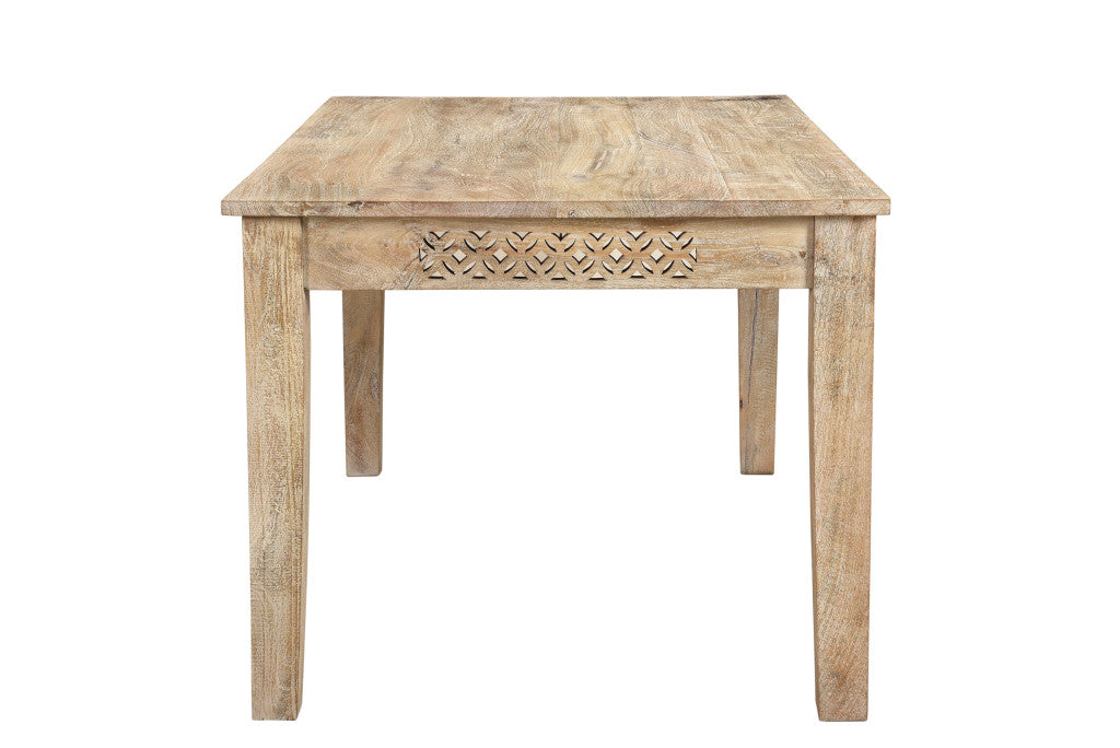 - Hand crafted by skilled artisans. This rustic washed dining table has gorgeous carved detailing that gives it a special look.