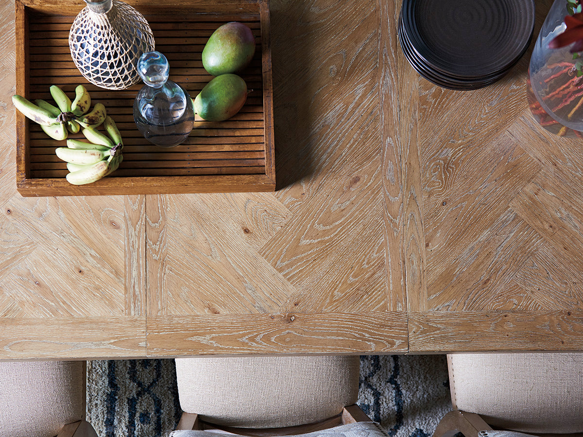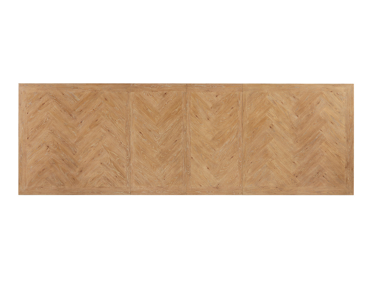 - Elegant herringbone veneer pattern on the tabletop, adding a sophisticated touch to your dining experience.