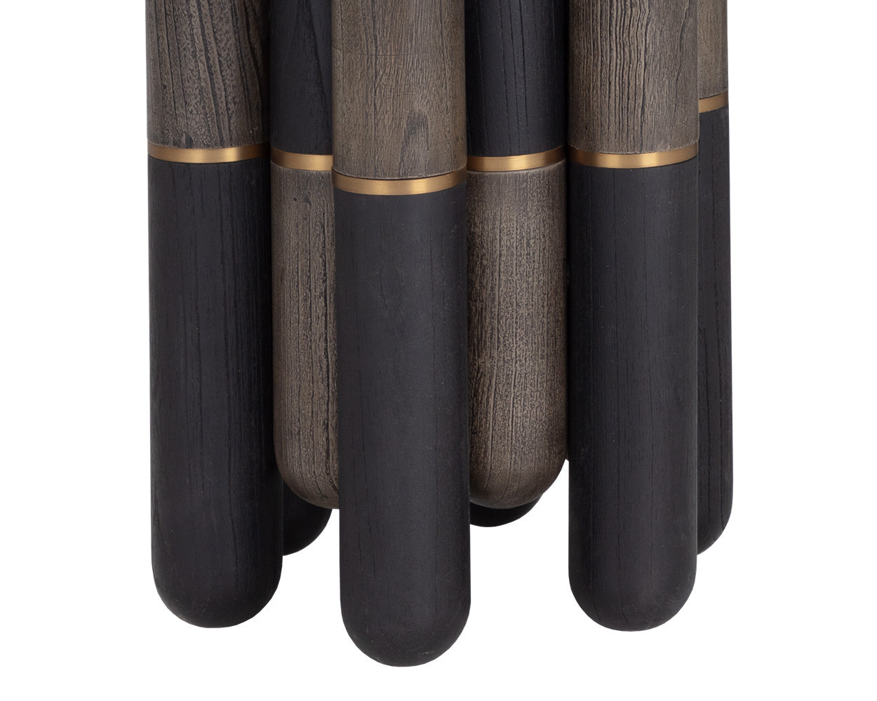 - 12mm Clear Glass Top / Solid Mindi Wood Base with Antique Brass Stainless Steel Accent