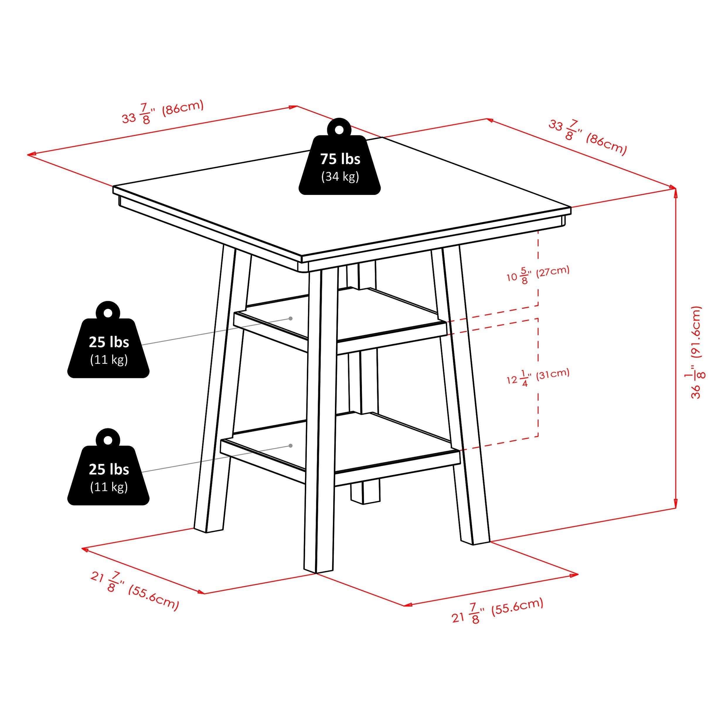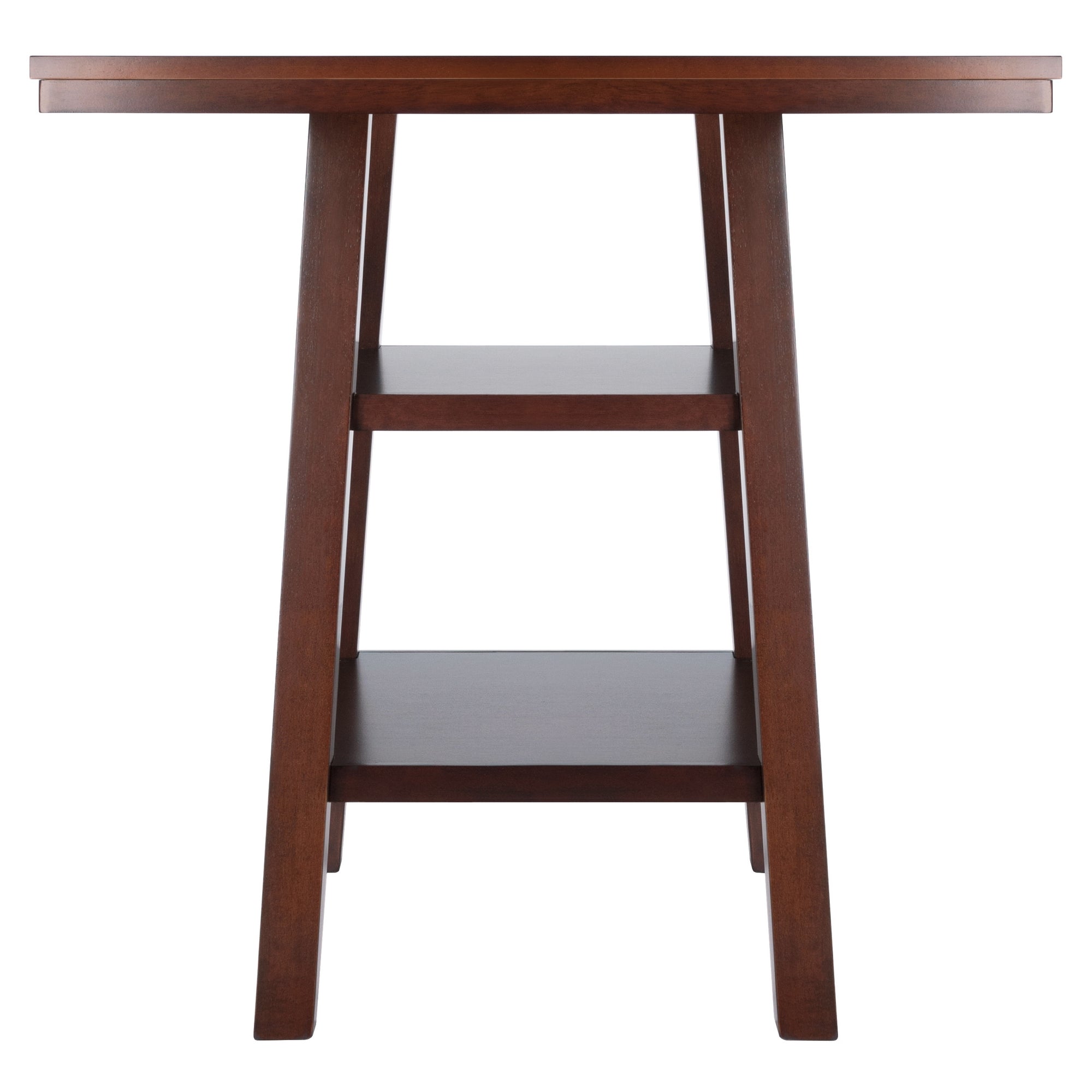 The Orlando High Table combines simplicity and function, reminiscent of a country home antique. It's ideal as a compact dining table, or pull up a counter stool and use it as a desk or workspace. This handsome table can also be used to hold serving pieces or display collectibles. The two open shelves offer generous storage for dishes, glassware, and more. Finished in a warm walnut, the table is made of solid and composite wood for long-lasting stability. Overall size is 33.8"W x 33.8"D x 36"H.