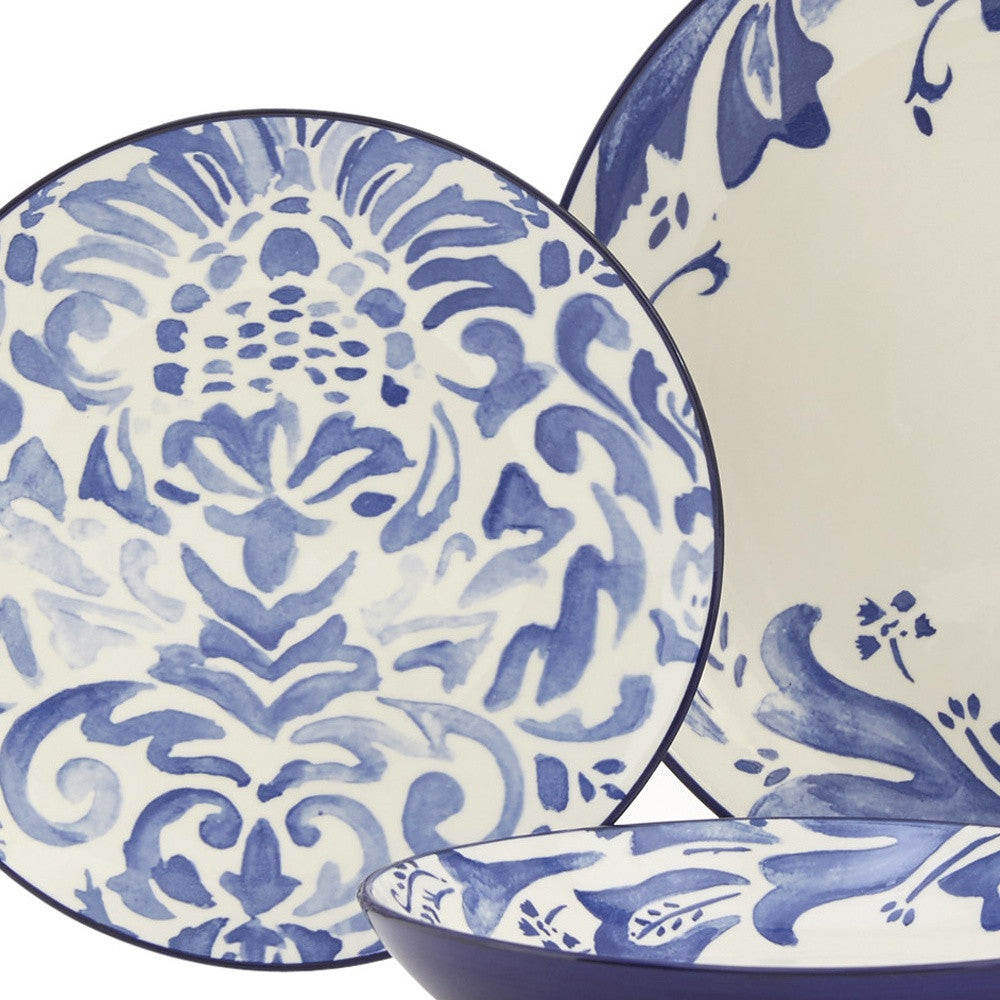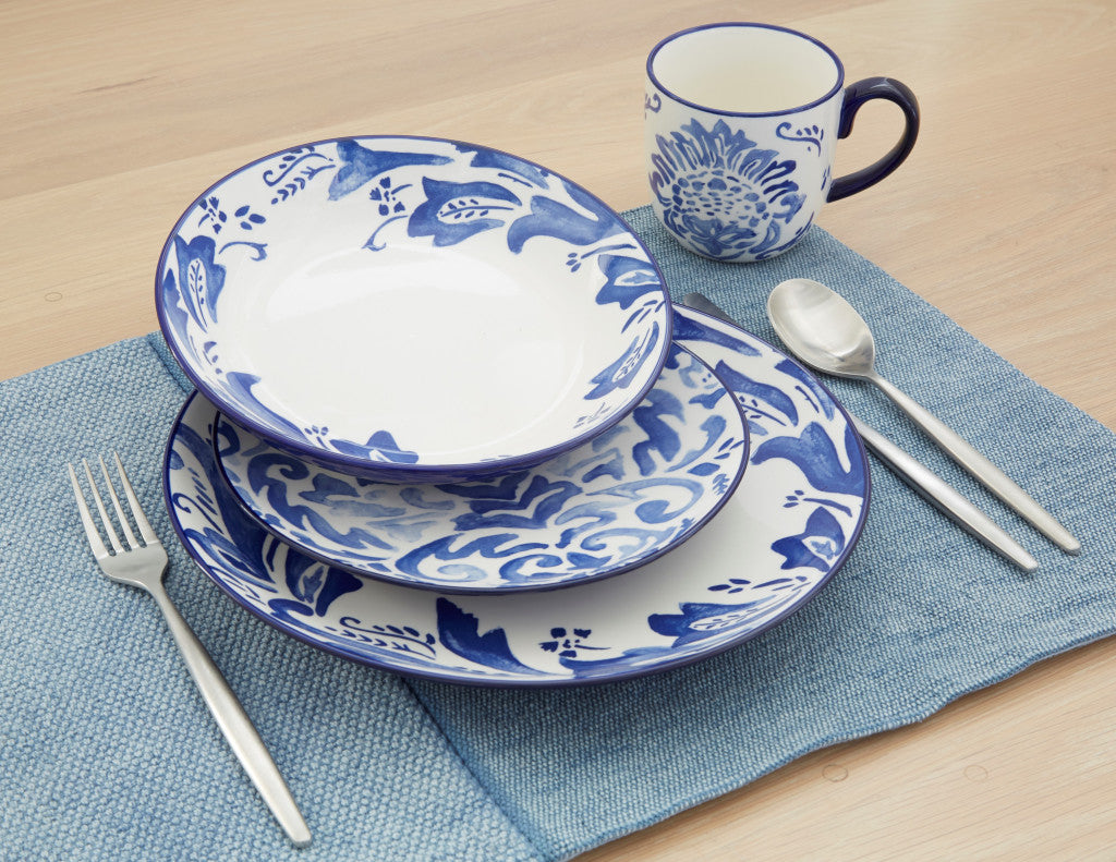 - Gorgeous European inspired, distressed blue floral pad print design on creamy white dinnerware accented by navy blue.