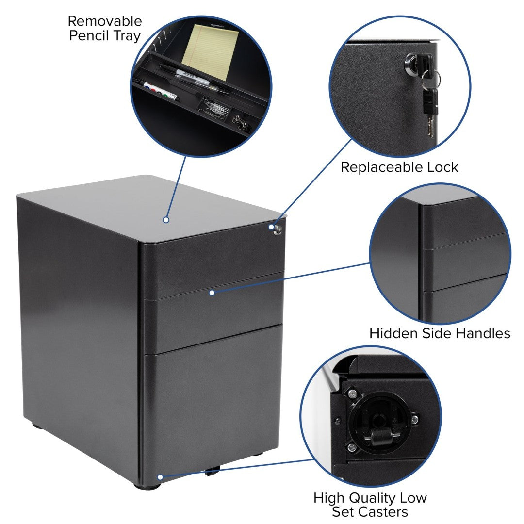 - Dimensions (Filing Cabinet): 15.5"W x 21"D x 22.75"H — compact locked storage with interlocking tip prevention for safety.