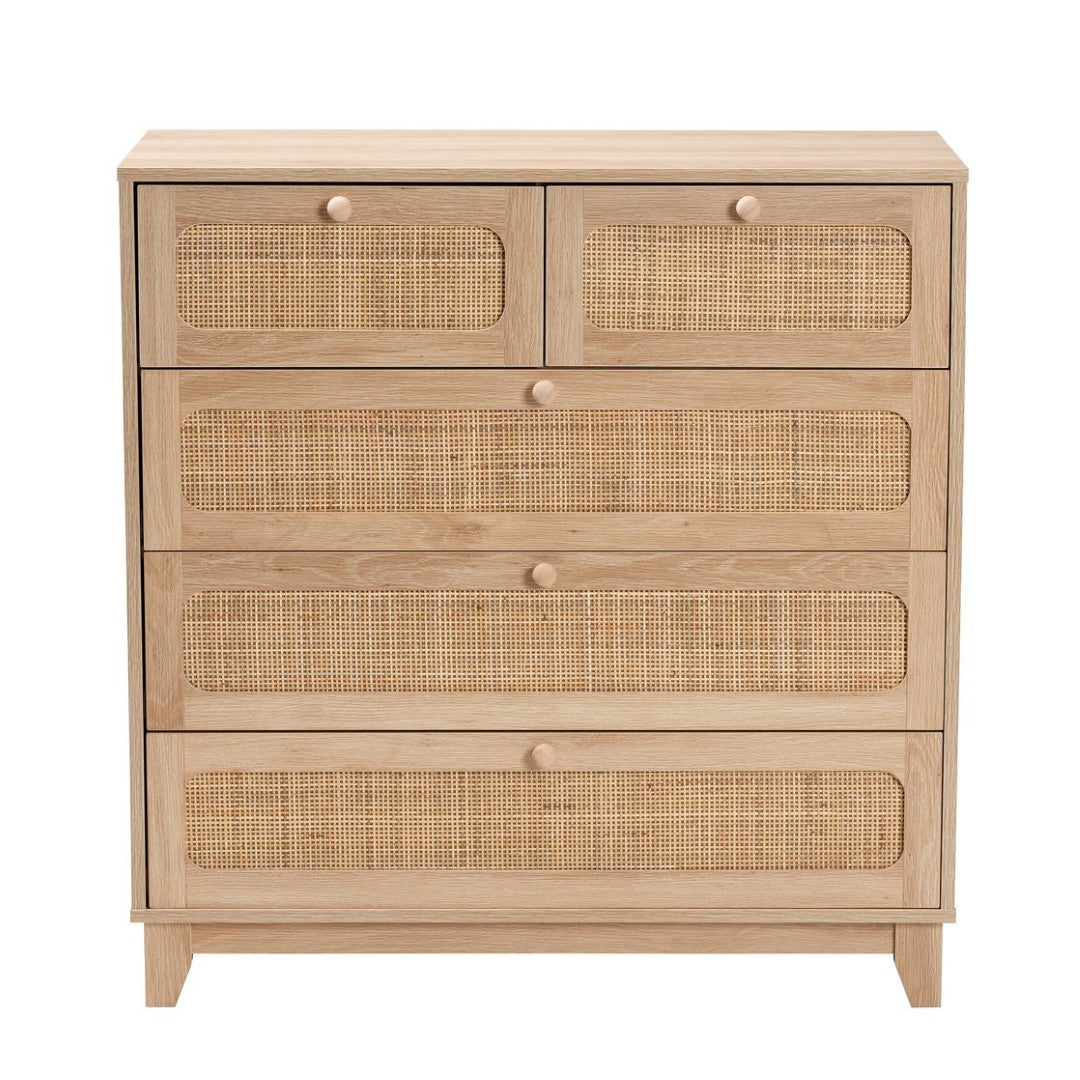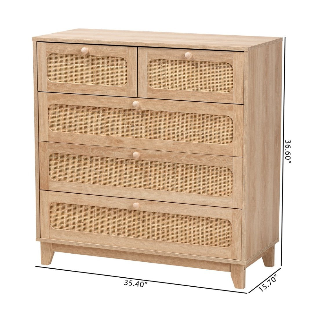 Elevate your storage and styling with the Elsbeth mid-century modern cabinet — a versatile, well-proportioned piece that combines warm oak-toned wood and natural woven rattan for a timeless, textured look. Designed to organize essentials without sacrificing form, Elsbeth offers a broad tabletop for display, five smoothly operating drawers for sorted storage, and tapered legs that keep the silhouette airy and stable. Natural material variations give each cabinet a unique character.