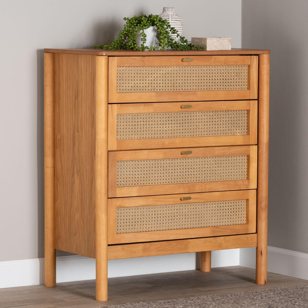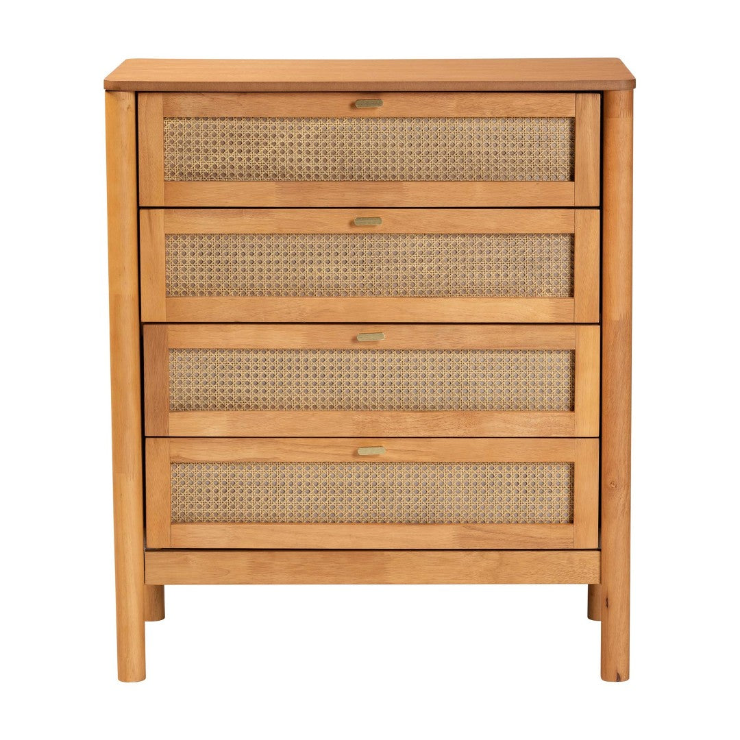 Bring a calming blend of Japanese minimalism and Scandinavian warmth to your bedroom with this Jenn 4-drawer chest. Crafted from rubberwood and engineered wood with woven distressed-finished rattan drawer fronts, this piece balances clean lines and natural texture to create a versatile, refined focal point. Four soft-close drawers offer organized storage while the tabletop remains available for a lamp, decor, or essentials. Rounded legs and metal pulls complete the serene, modern silhouette.