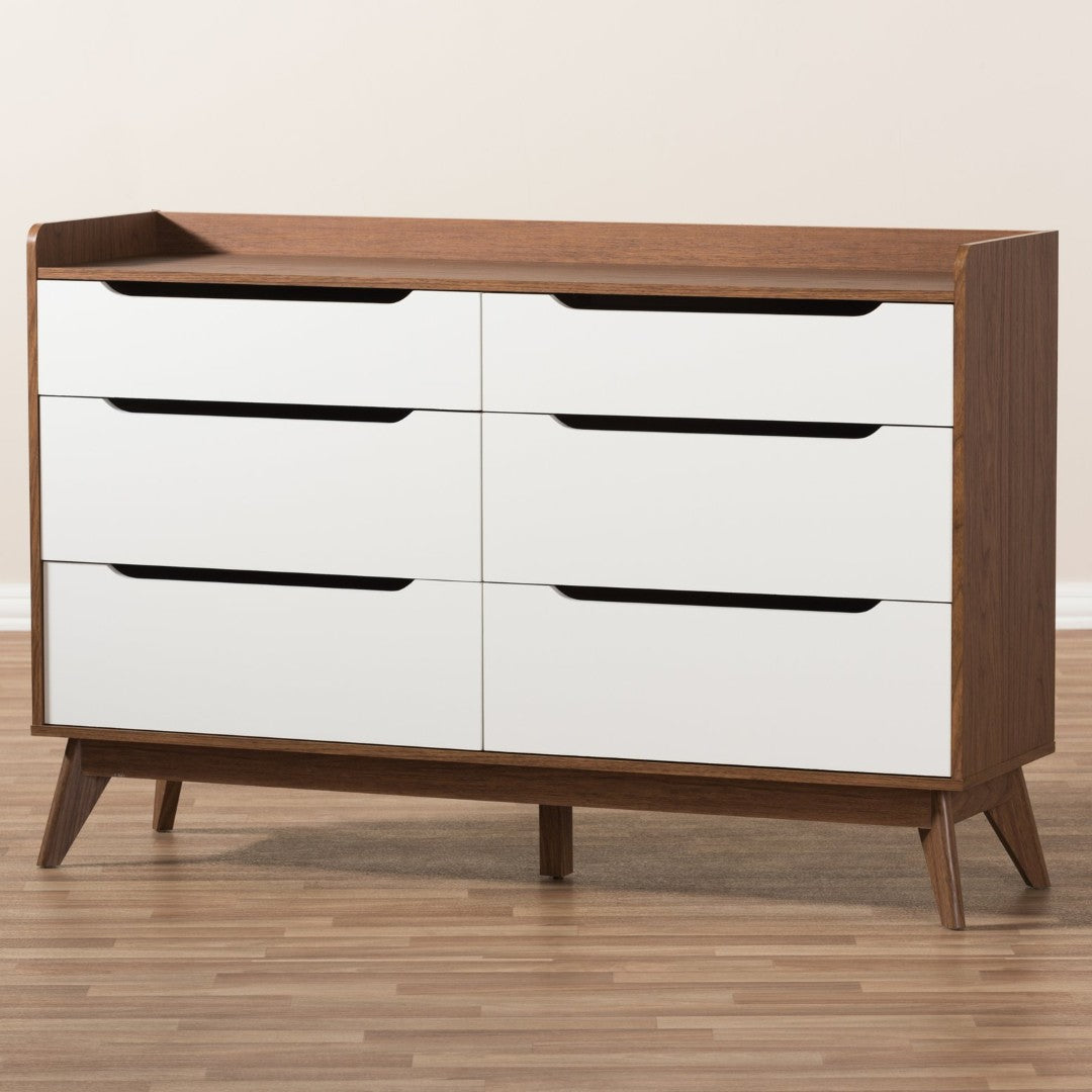 Brighton combines mid-century charm with modern functionality to bring a clean, airy look and plentiful storage to bedrooms, guest rooms, or multipurpose spaces. Its two-tone white and walnut finish, angled legs, and cut-out drawer handles create a minimalist Scandinavian aesthetic while the six drawers and shallow top shelf keep clothing, linens, and everyday items neatly organized and within easy reach. Built from engineered wood and MDF, the dresser is both stylish and practical for everyday use.
