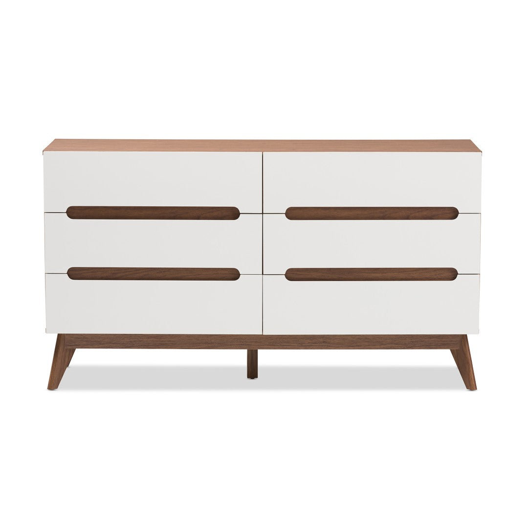 Bring mid-century Scandinavian calm and functional elegance to your bedroom or living space with this two-tone 6-drawer storage dresser. Clean lines, a walnut-and-white finish, and angled legs create a stylish focal point while six roomy drawers keep clothing and accessories neatly organized. The Calypso’s simple, durable engineered-wood construction and cut-out drawer handles combine form and function for everyday use.
