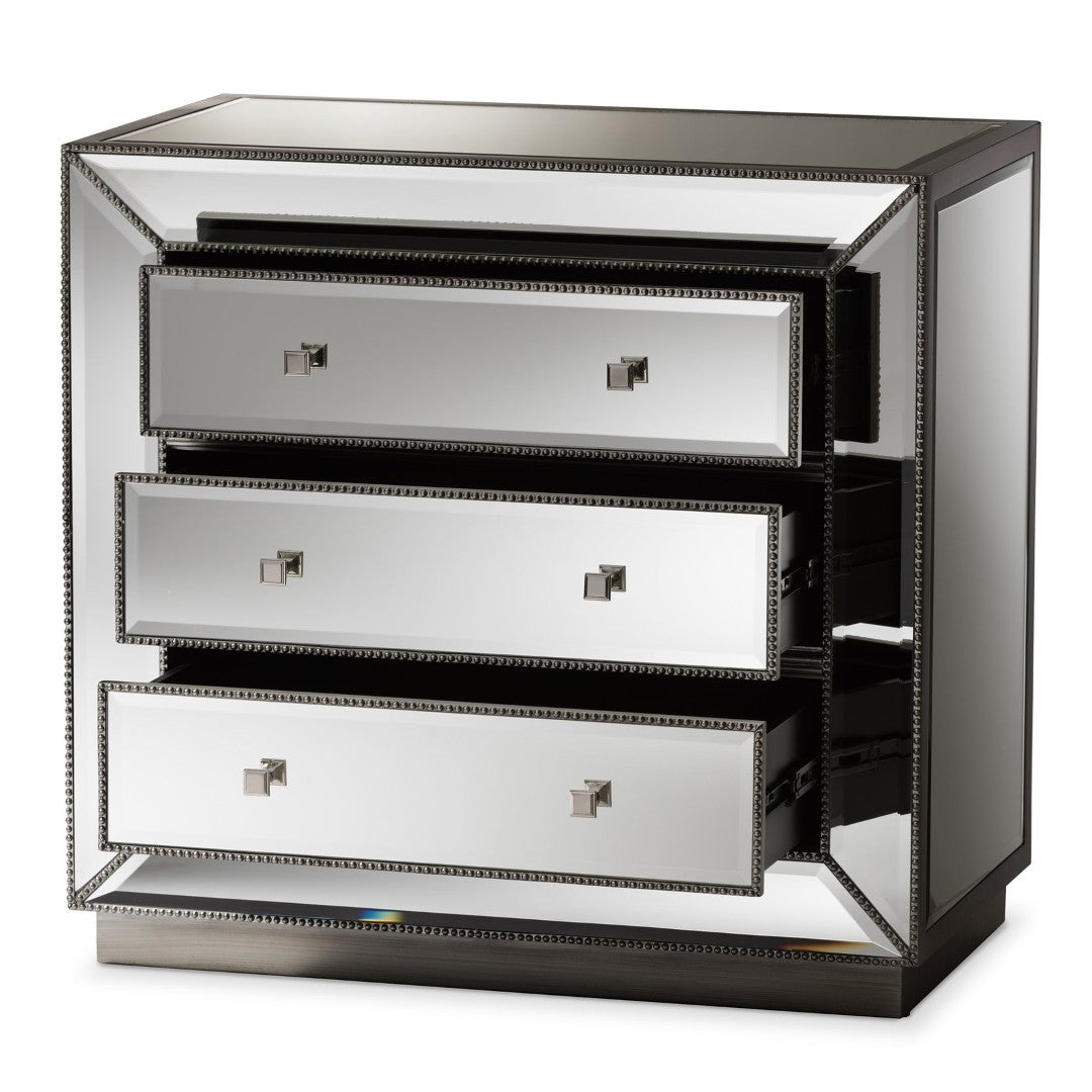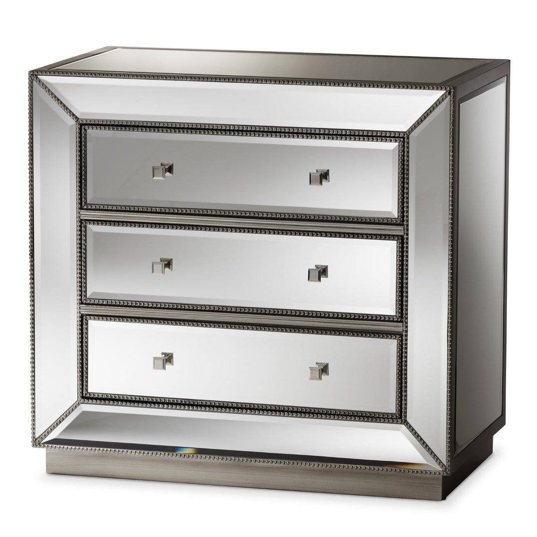 Elevate any room with sleek Hollywood Regency glamour—this mirrored 3-drawer cabinet combines reflective surfaces, gold-tone beaded trim, and faceted crystal-clear pulls to create a striking focal point that both shines and stores. Its champagne-accented frame and beveled mirror panels bounce light around the space while offering generous concealed storage in three smooth-gliding drawers.