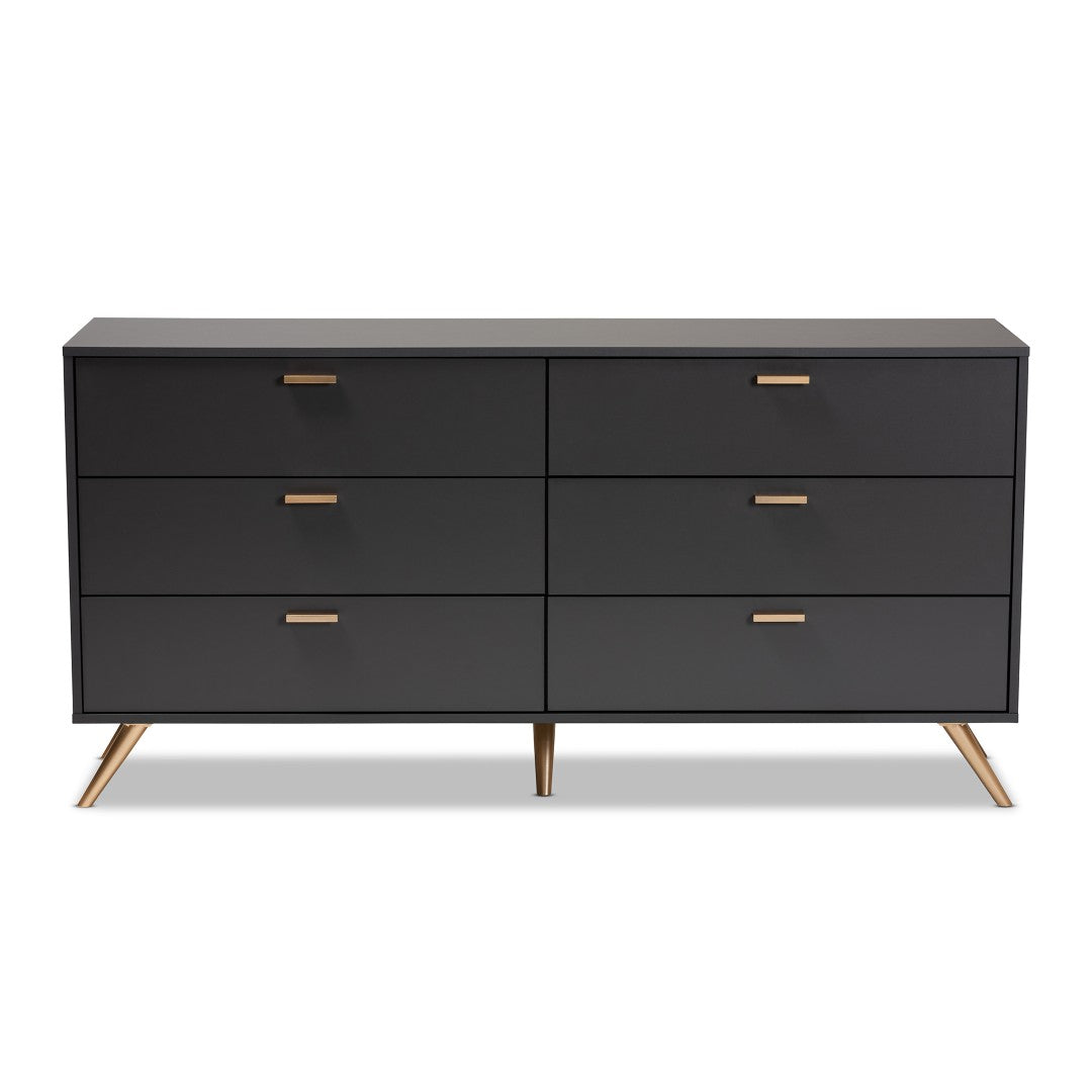 Elevate your bedroom with the Kelson dresser — a sleek blend of modern minimalism and practical storage. Crafted with a sturdy engineered wood frame and finished in dark grey, this piece pairs clean lines with gold-tone accents for a refined, contemporary look. Its six spacious drawers keep clothing and linens organized while angled gold legs add stability and a luxe visual touch. Designed for everyday use and delivered with an anti-topple kit, the Kelson is a stylish, functional anchor for modern interiors.