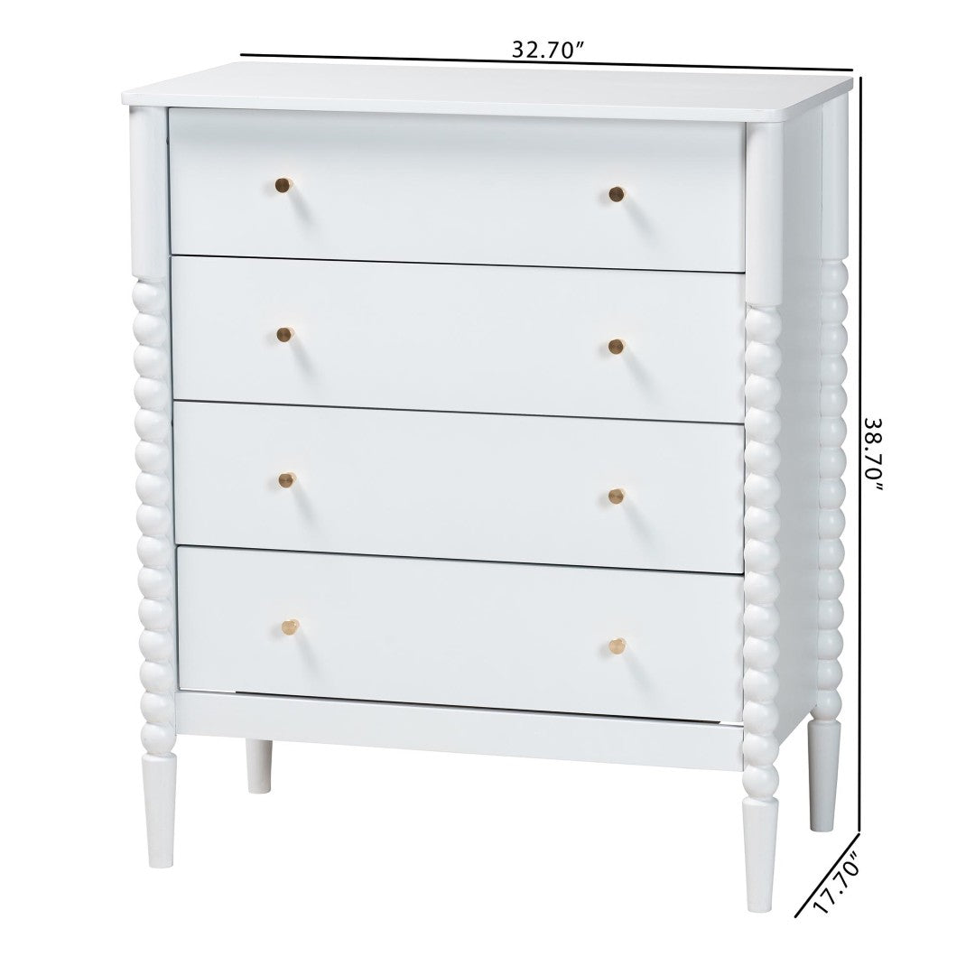 Bring mid-century charm and practical storage to your bedroom with a beautifully detailed chest that blends vintage-inspired design with modern functionality. The turned bobbin legs and clean white finish create an elegant focal point, while four interlocking drawers keep clothing and linens neatly organized. Designed for easy assembly and everyday use, this piece offers both style and stability for a polished, timeless look.