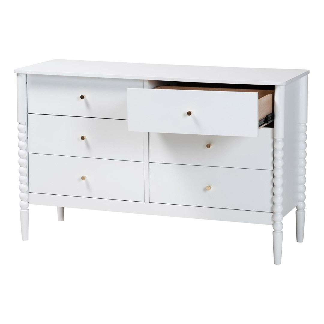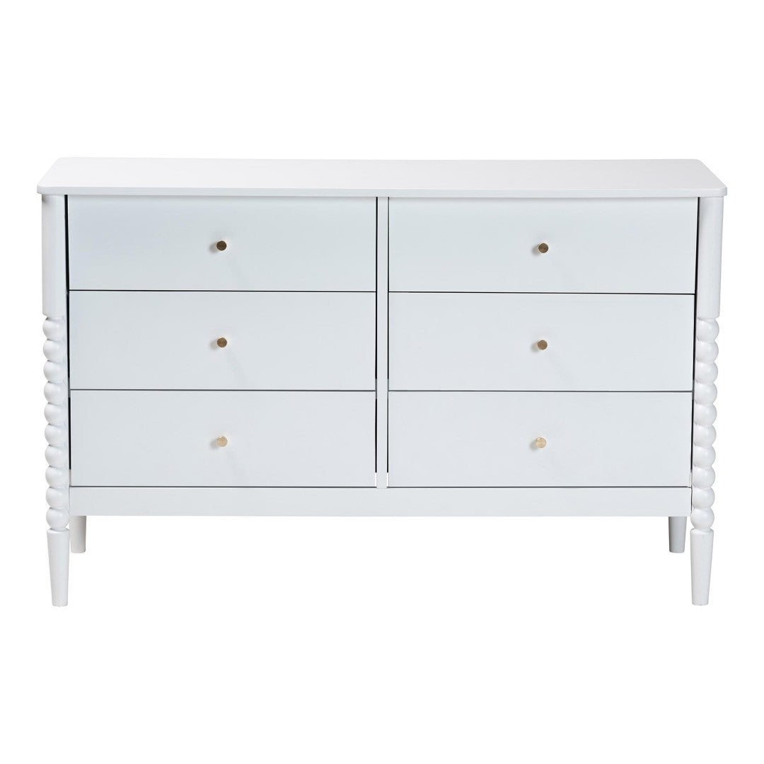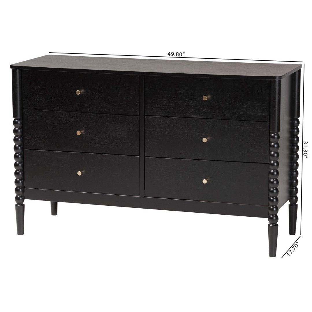 Bring a touch of mid-century elegance to your bedroom with this Lucera 6-drawer dresser. Clean silhouettes, turned bobbin detailing and minimalist metal knobs combine classic charm with modern functionality, providing ample organized storage while leaving the top surface free for decor. Built from rubberwood and engineered wood for durability, this piece balances style and practicality and ships as a small parcel for easy delivery.