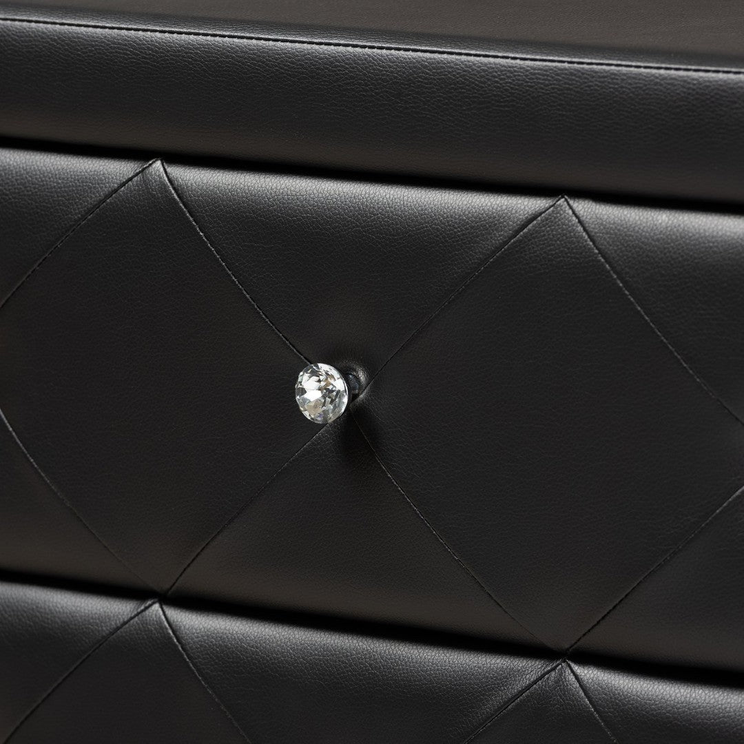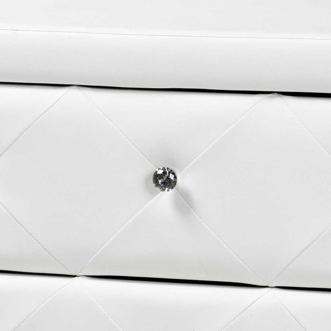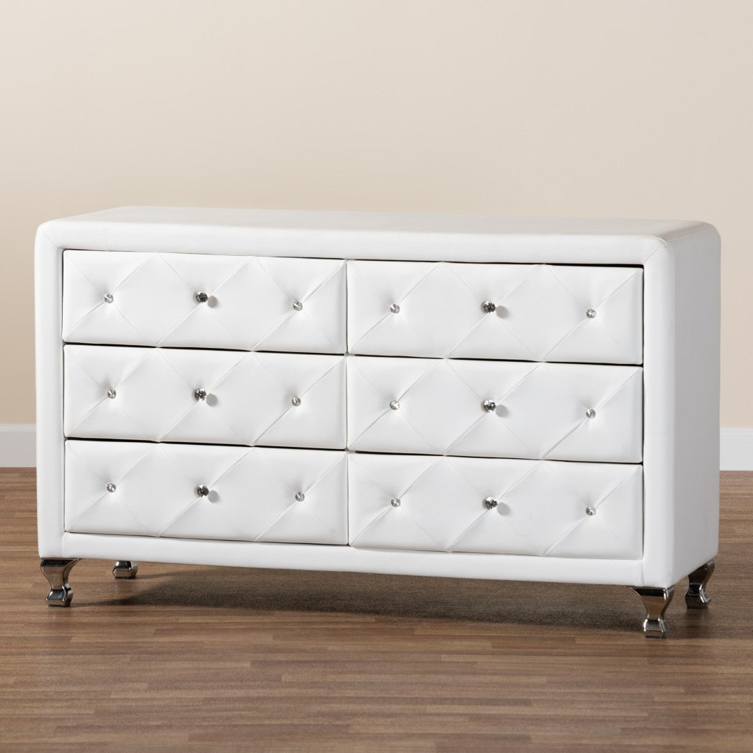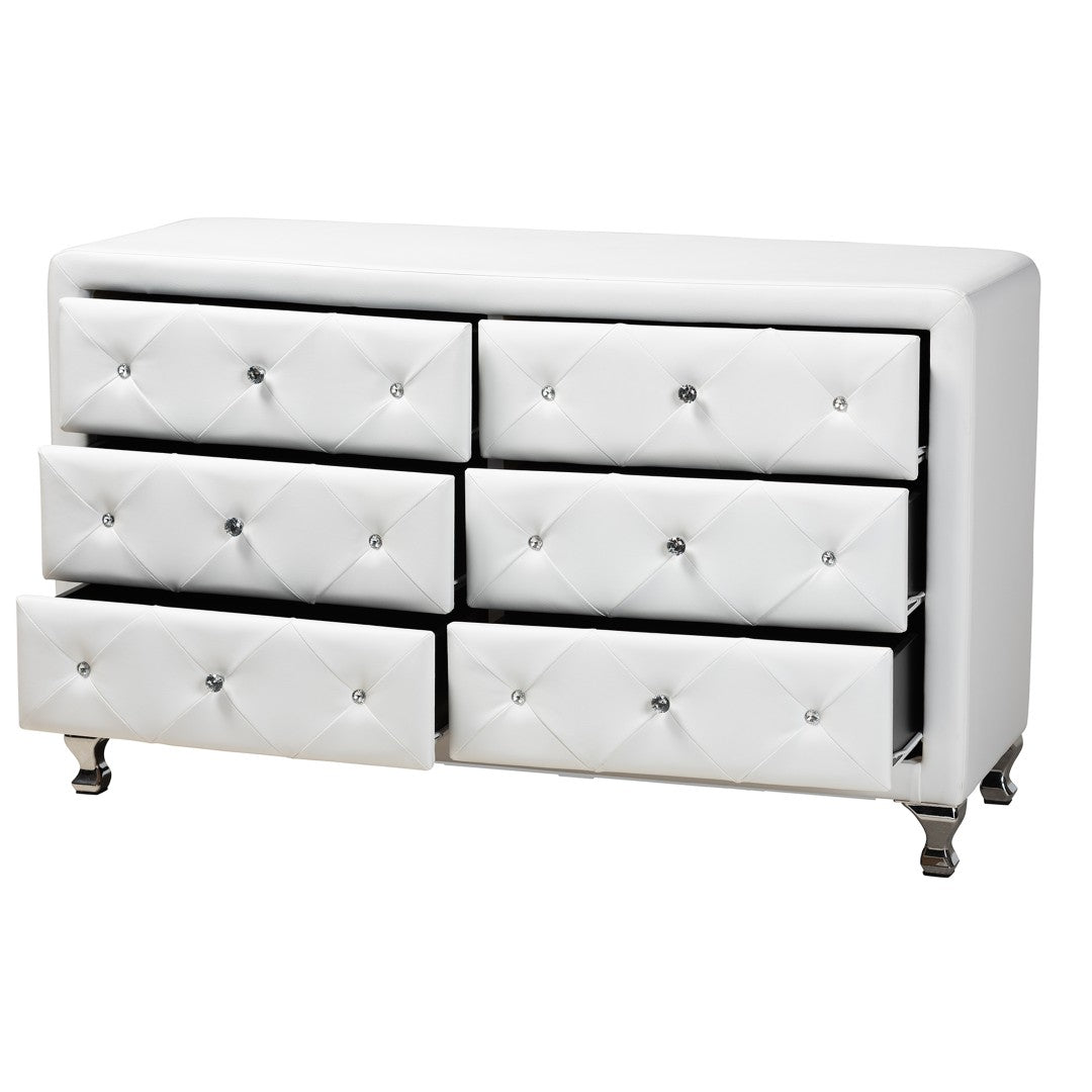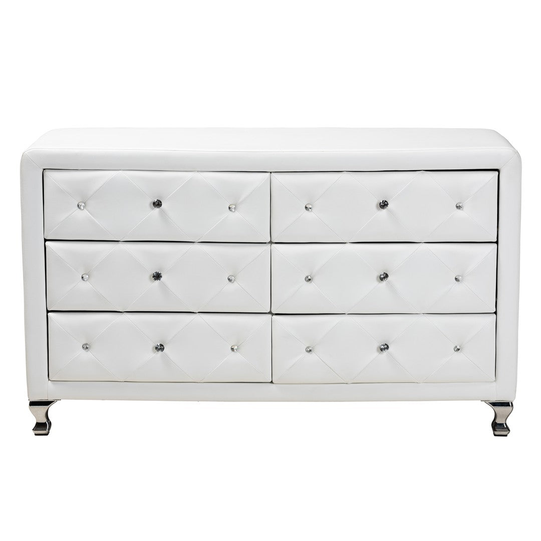 Elevate your bedroom with a striking blend of modern glamour and practical storage. This upholstered dresser pairs a clean white faux-leather exterior with sparkling faux-crystal accents and chrome-plated steel legs, delivering a contoured, contemporary silhouette that becomes a focal point while keeping your essentials neatly organized.