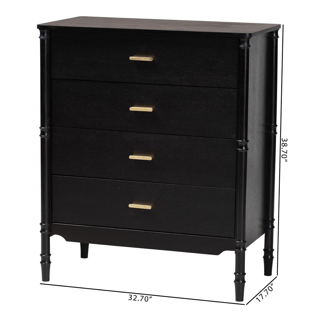 Elevate your bedroom or guest room with the Marisela chest — a refined, mid-century–inspired dresser that blends classic silhouette and modern detailing. Crafted from sturdy rubberwood and engineered wood, this piece delivers reliable storage and a polished display surface while its bamboo-inspired turned legs and gold-tone metal handles add a touch of sculptural elegance. The Marisela is ideal for those seeking a versatile accent that complements transitional, modern, or classic interiors.
